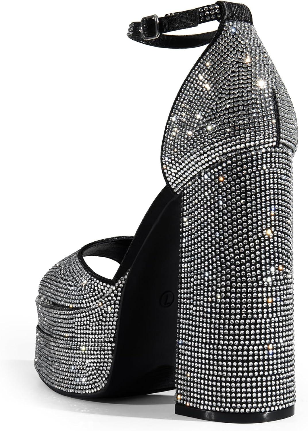 DREAM PAIRS High Heels Chunky Block Platform Heels for Women Ankle Strap Sexy Open Square Toe Heels Dressy Pumps Sandals(Black-rhinestone)