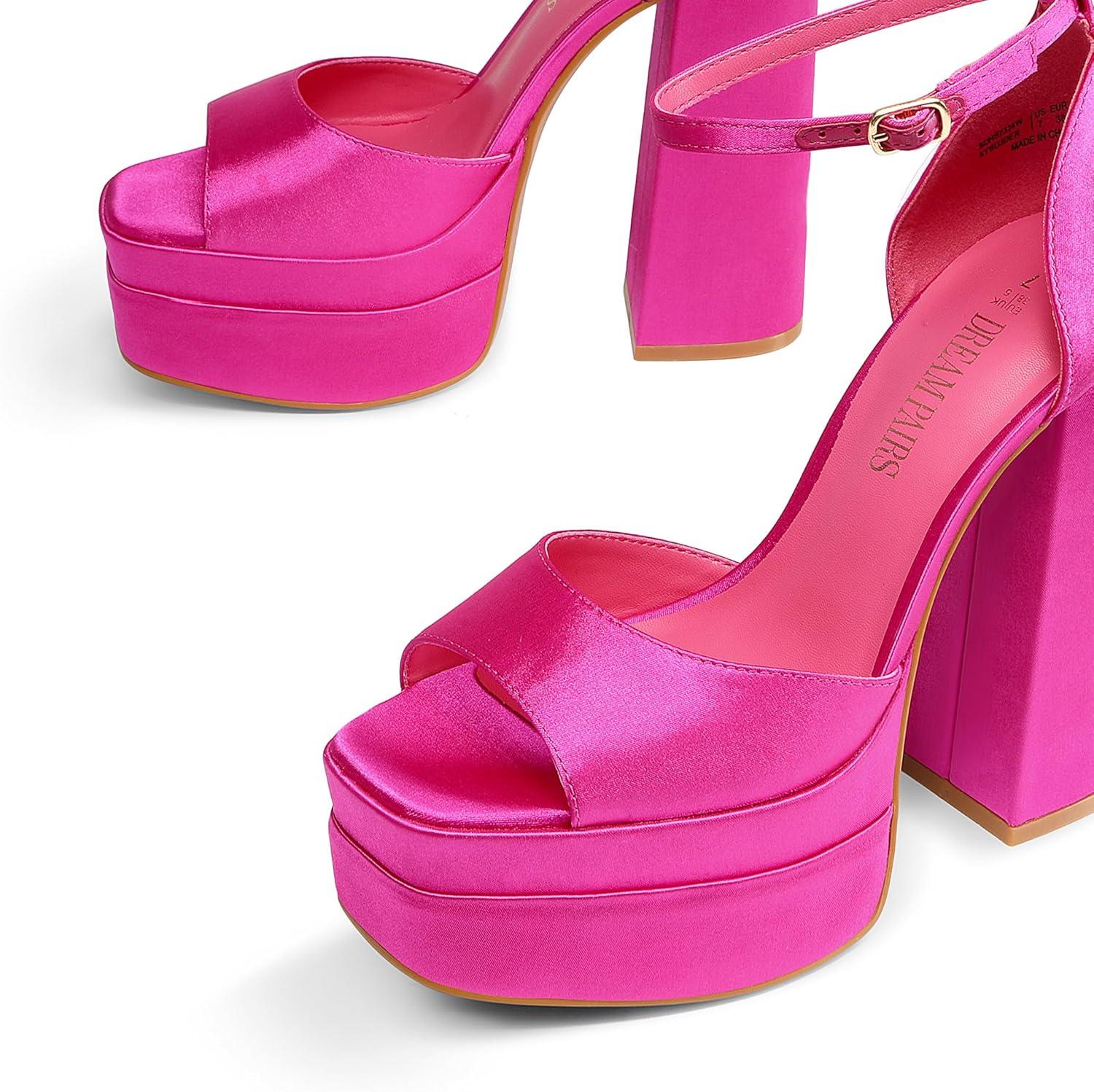 DREAM PAIRS High Heels Chunky Block Platform Heels for Women Ankle Strap Sexy Open Square Toe Heels Dressy Pumps Sandals(Hot Pink-satin)