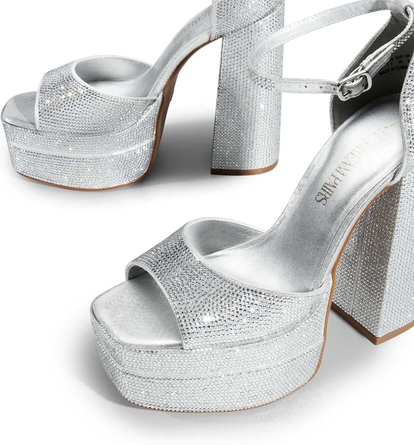 DREAM PAIRS High Heels Chunky Block Platform Heels for Women Ankle Strap Sexy Open Square Toe Heels Dressy Pumps Sandals(Silver-rhinestone)