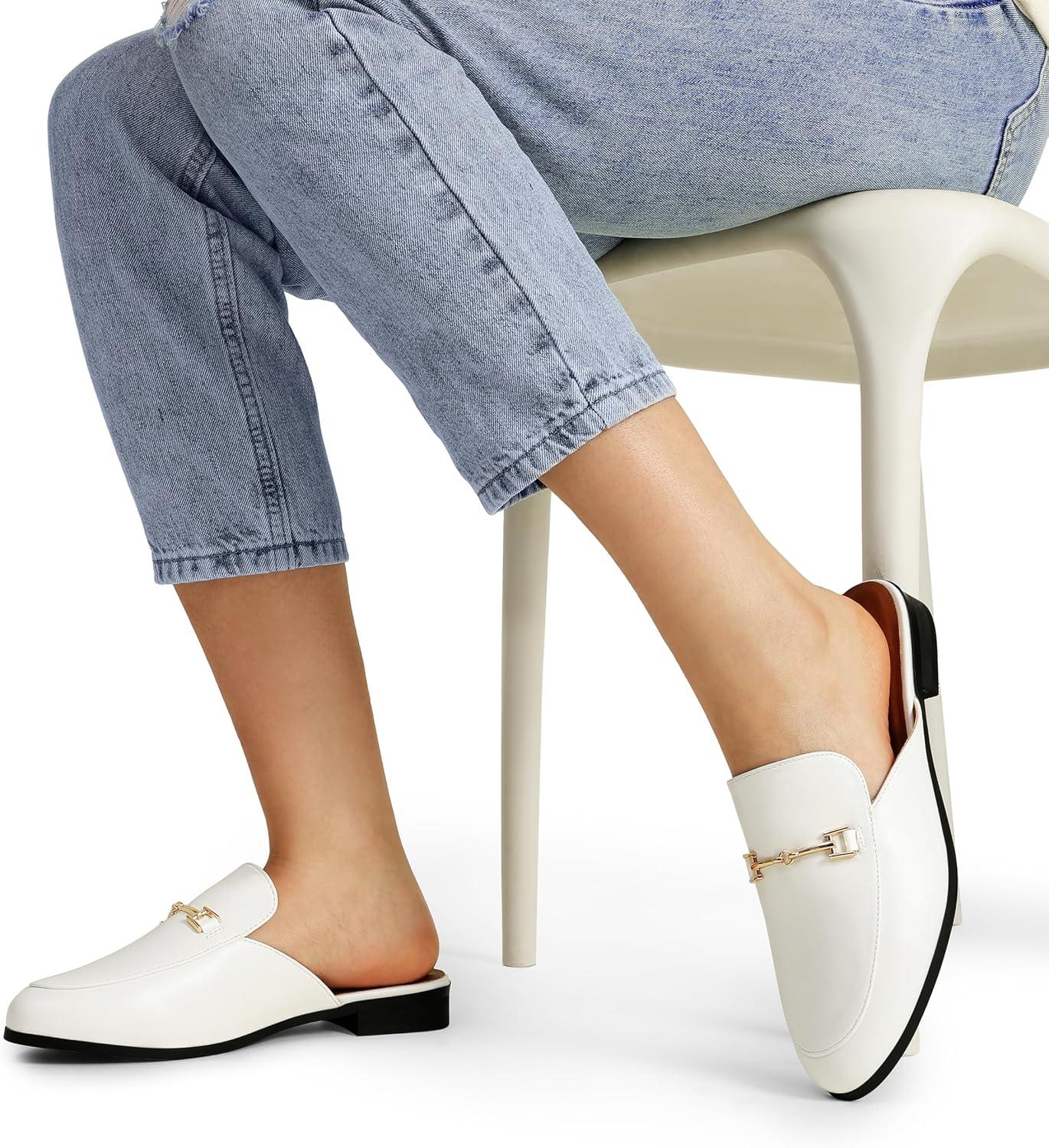 DREAM PAIRS Mules for Women Flats Comfortable Buckle Mules Slip on Slides Backless Loafers Shoes(White-pu)