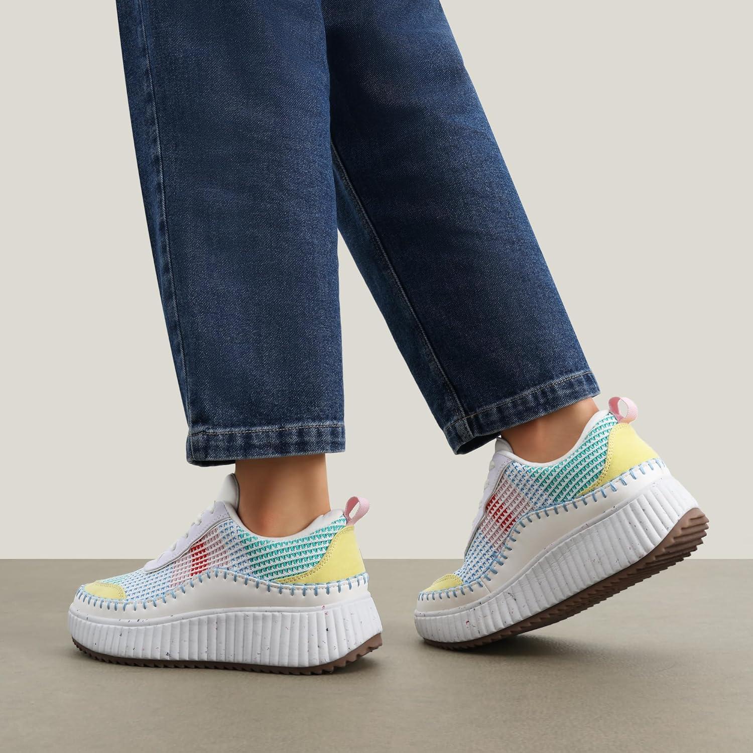DREAM PAIRS Women Chunky City Tweed Comfortable Casual Platform Fashion Sneaker(White/Rainbow)