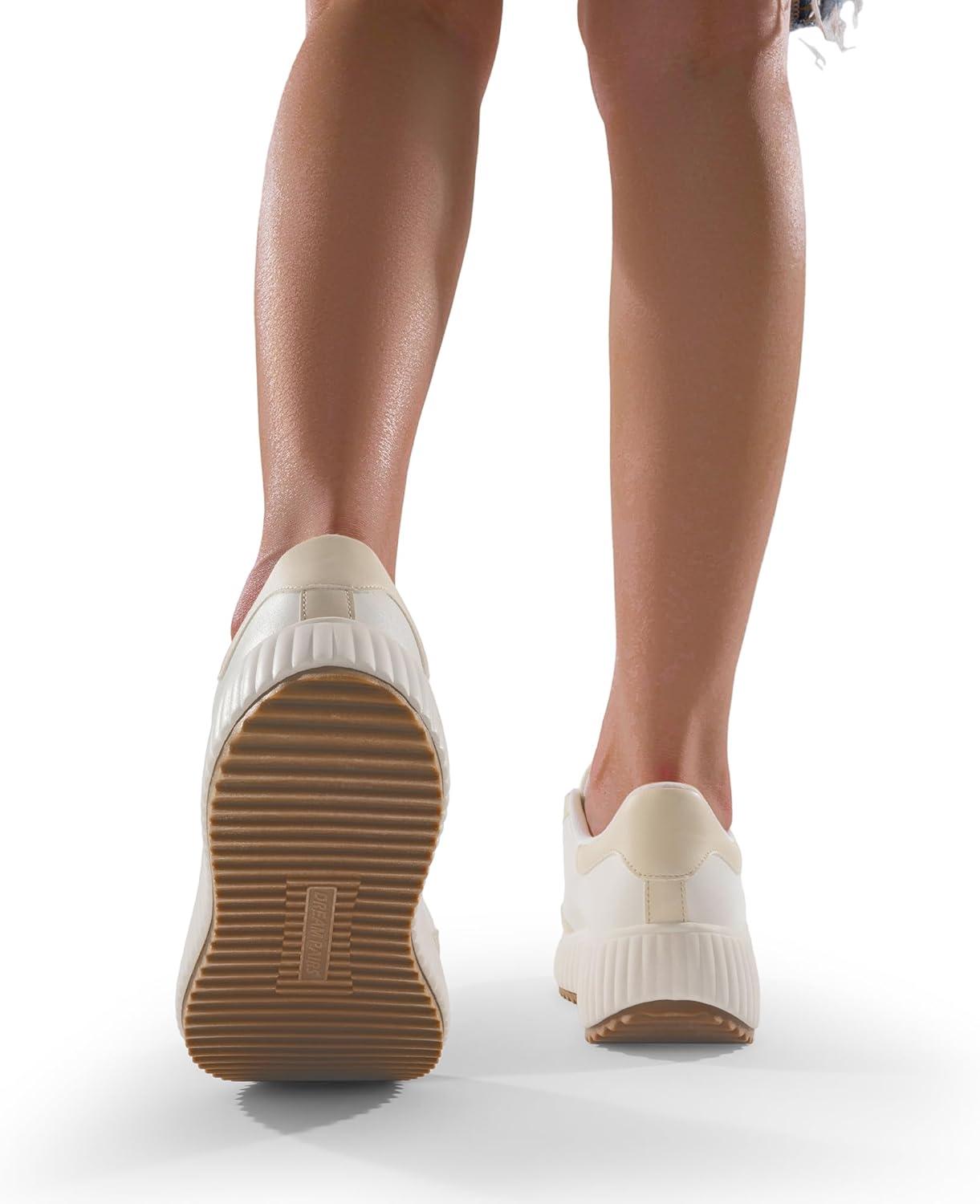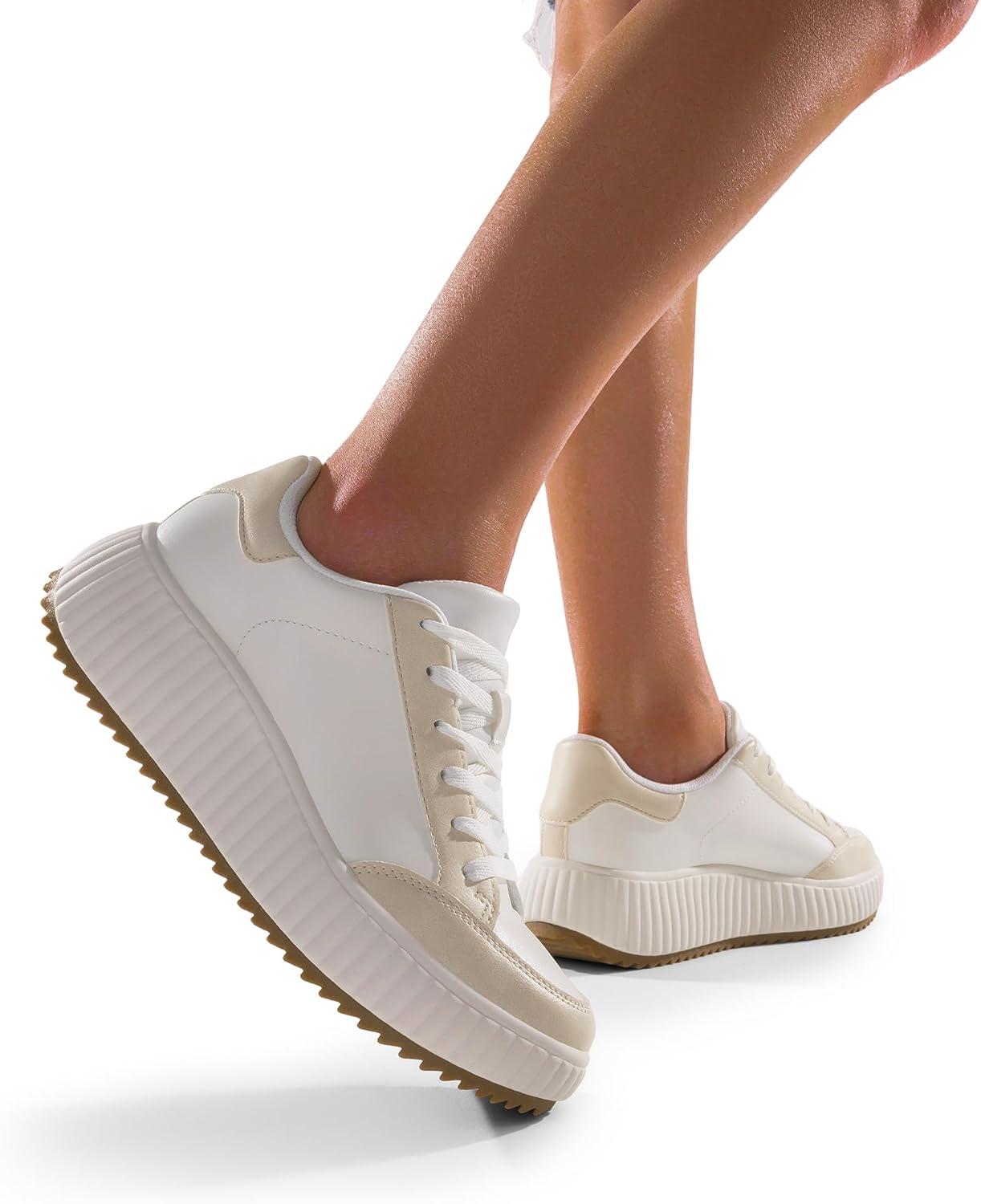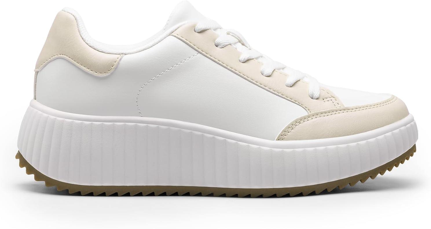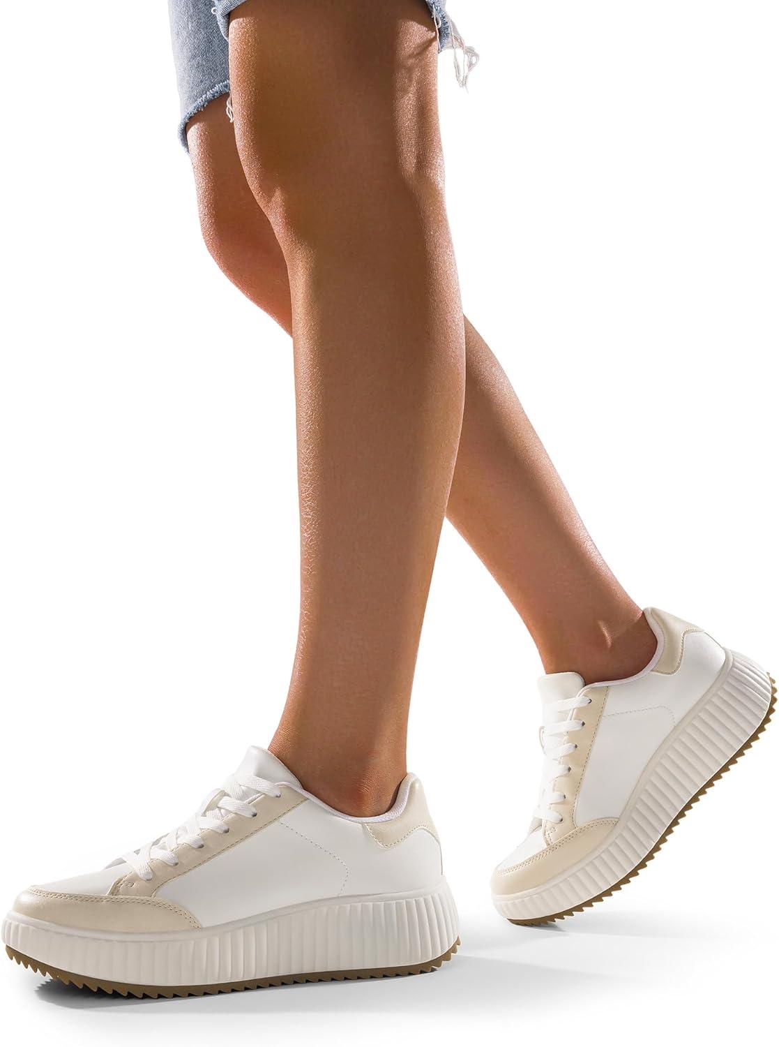 DREAM PAIRS Women Platform Chunky Lightweight Comfortable Casual Faux Leather Lace-Up Dee Walking Fashion Sneakers(White/Apricot)