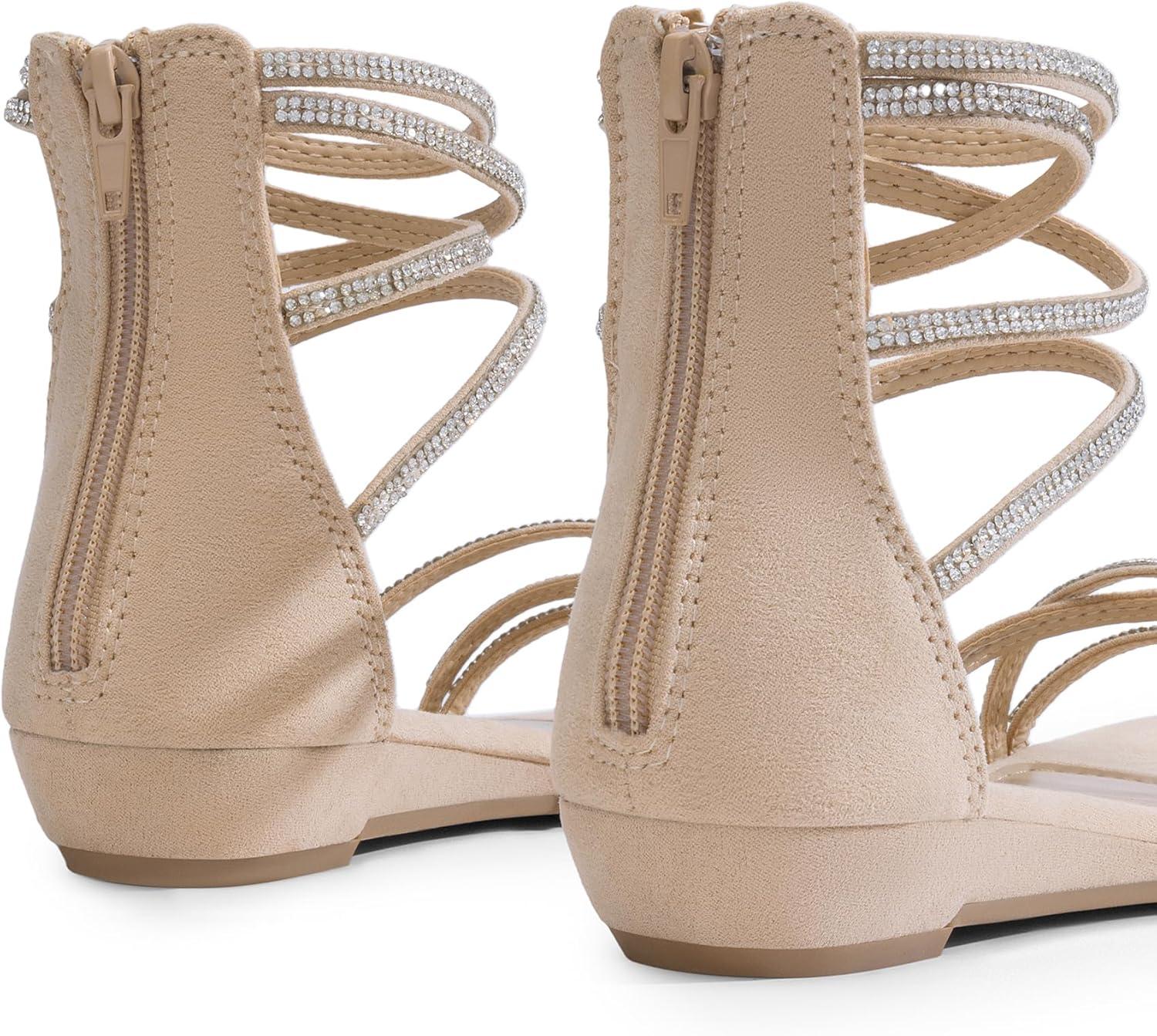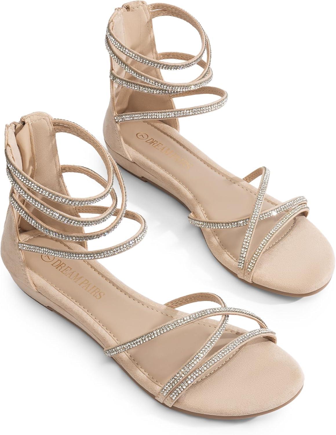 DREAM PAIRS Women’s Ankle Strap Flat Sandals Summer Dressy Strappy Gladiator Rhinestones Sandals(Nude)