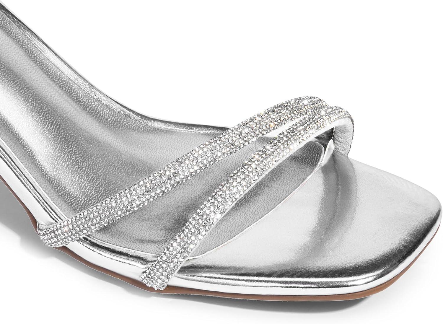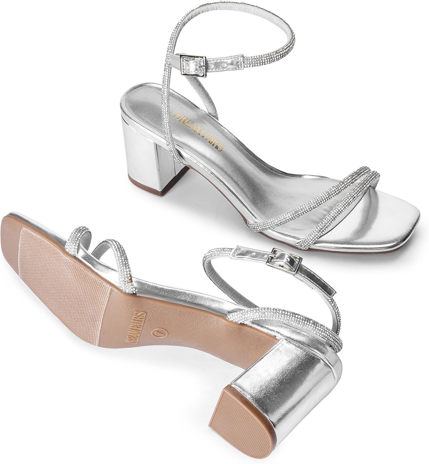 DREAM PAIRS Women’s Chunky Strappy Heels Square Open Toe Ankle Buckle Low Heels Sandals for Daily Wedding Party Dress(Silver-rhinestone)