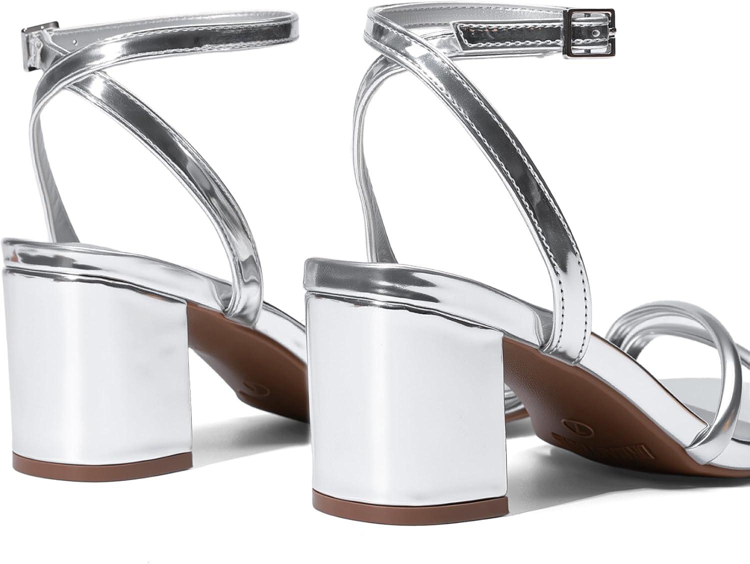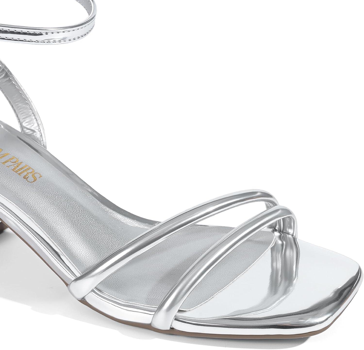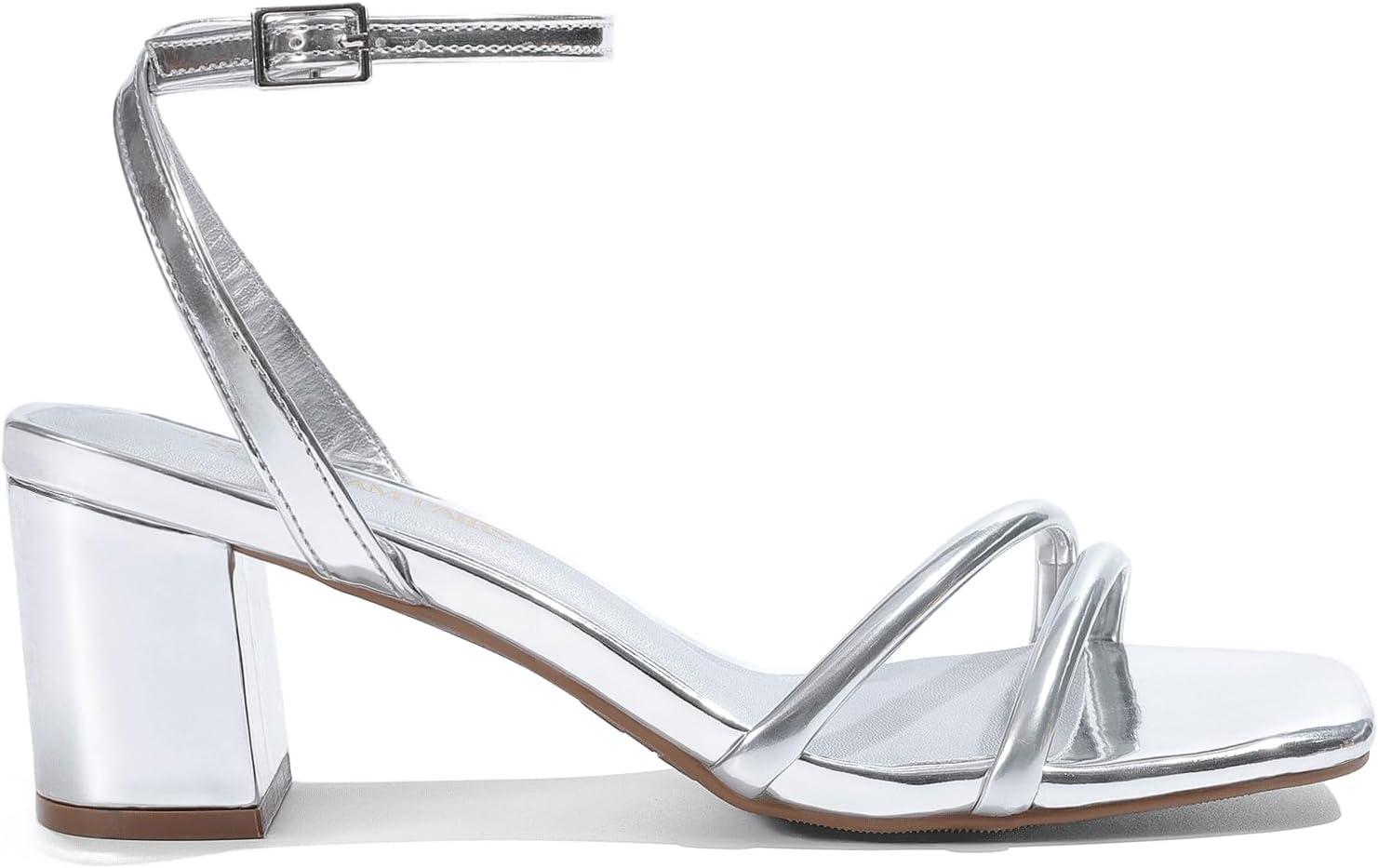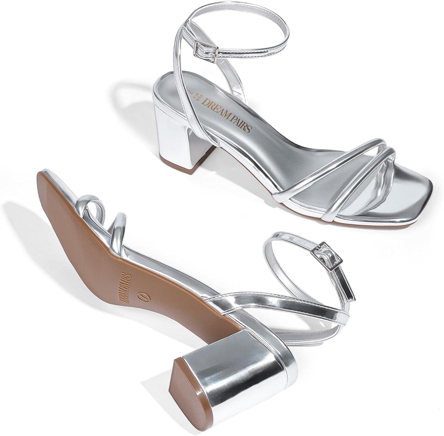 DREAM PAIRS Women’s Chunky Strappy Heels Square Open Toe Ankle Buckle Low Heels Sandals for Daily Wedding Party Dress(Silver)