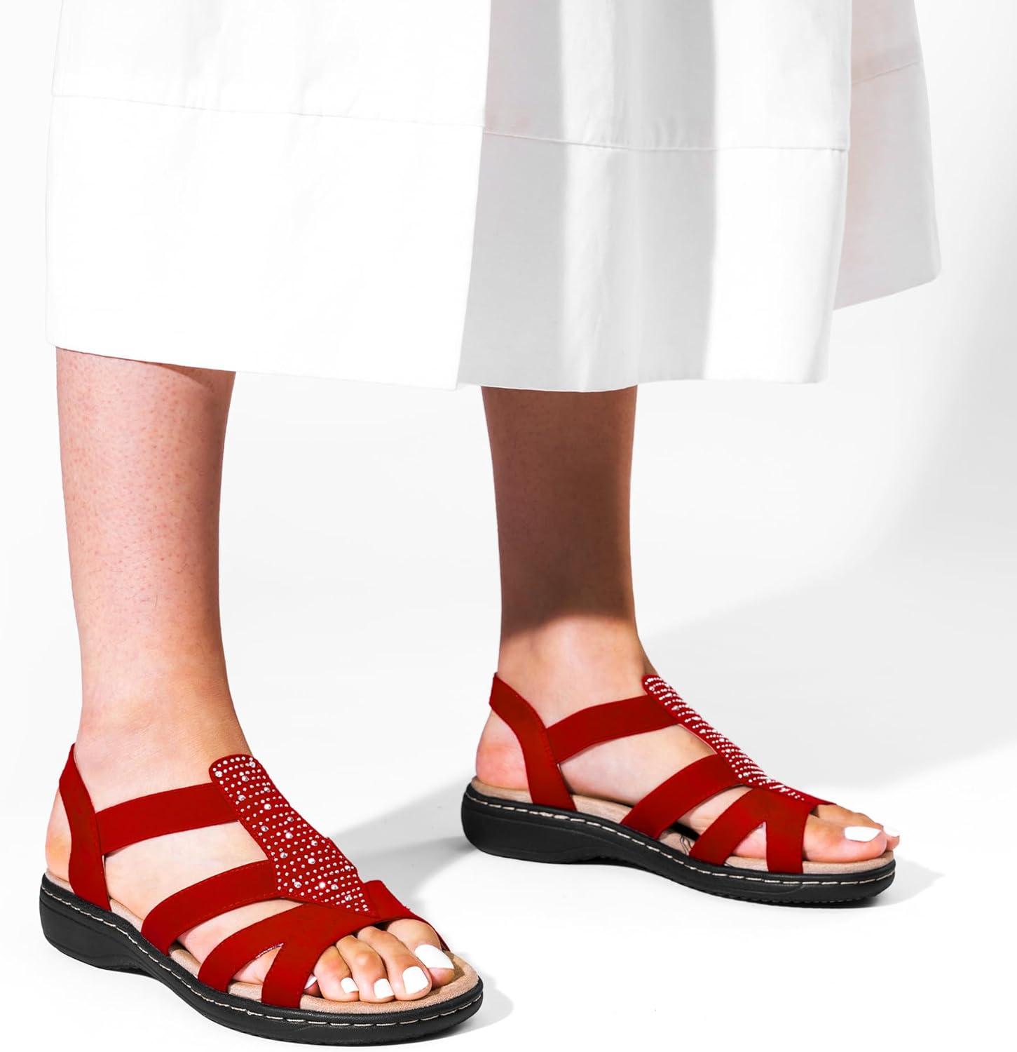 DREAM PAIRS Women’s Comfortable Arch Support Dressy Flat Sandals Elastic Open Toe Walking Shoes for Summer(Red)