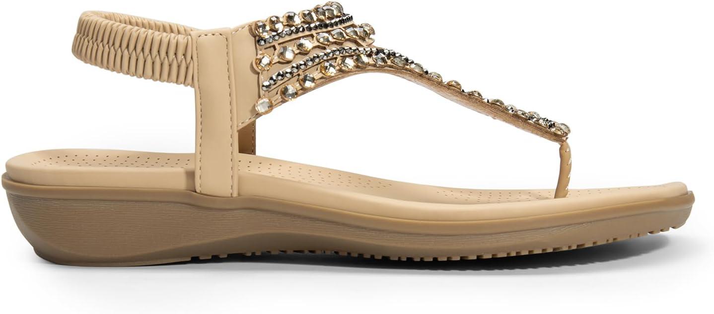 DREAM PAIRS Women’s Comfortable Dressy Flat Sandals Rhinestone Elastic T-Strap Thong Sandals for Summer Beach(Nude)