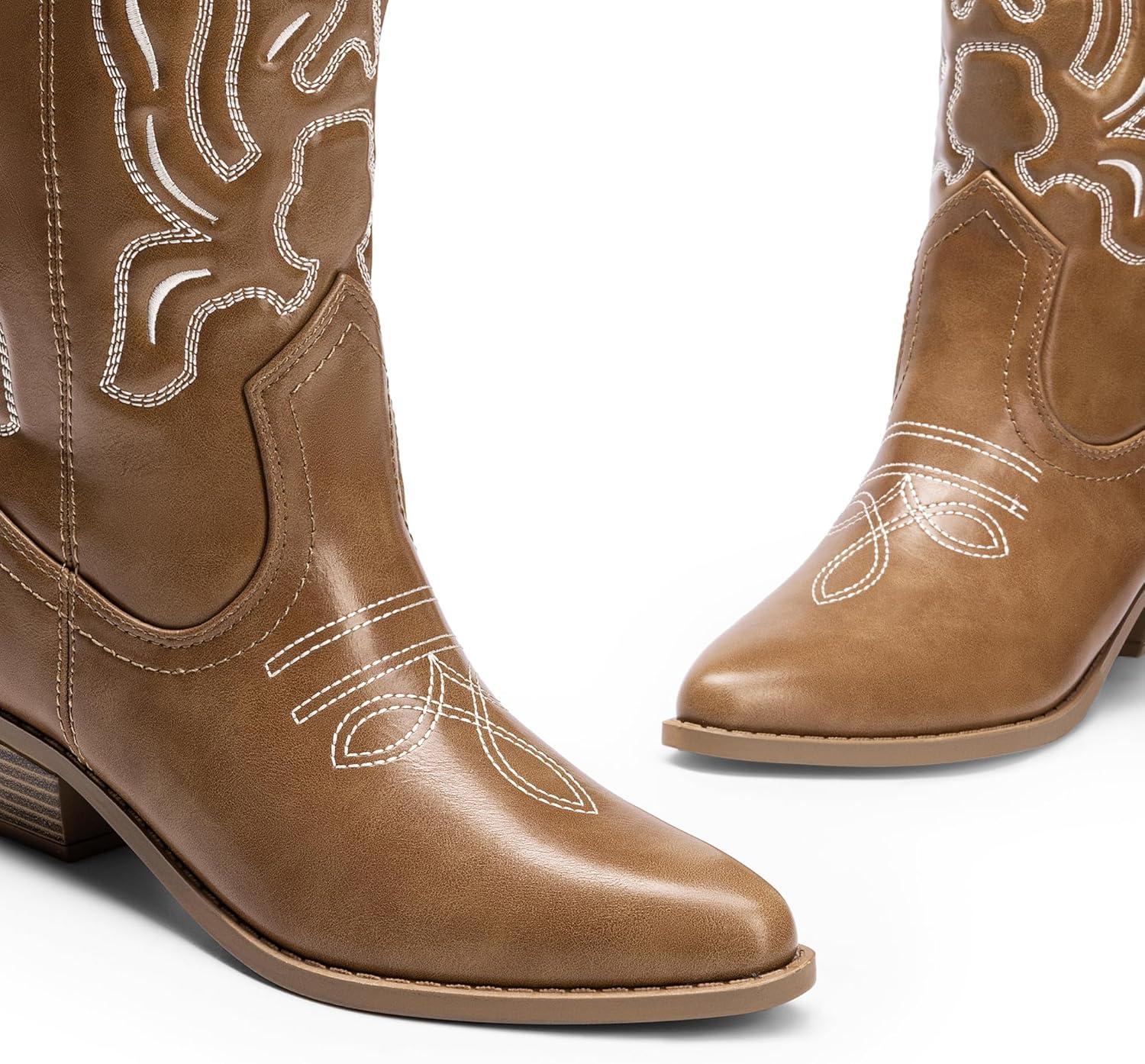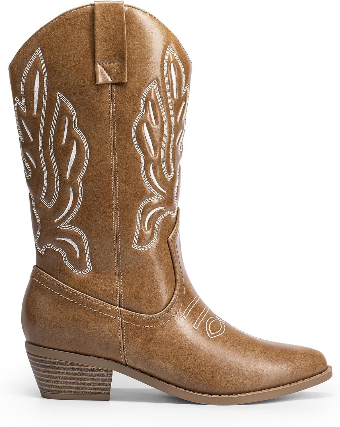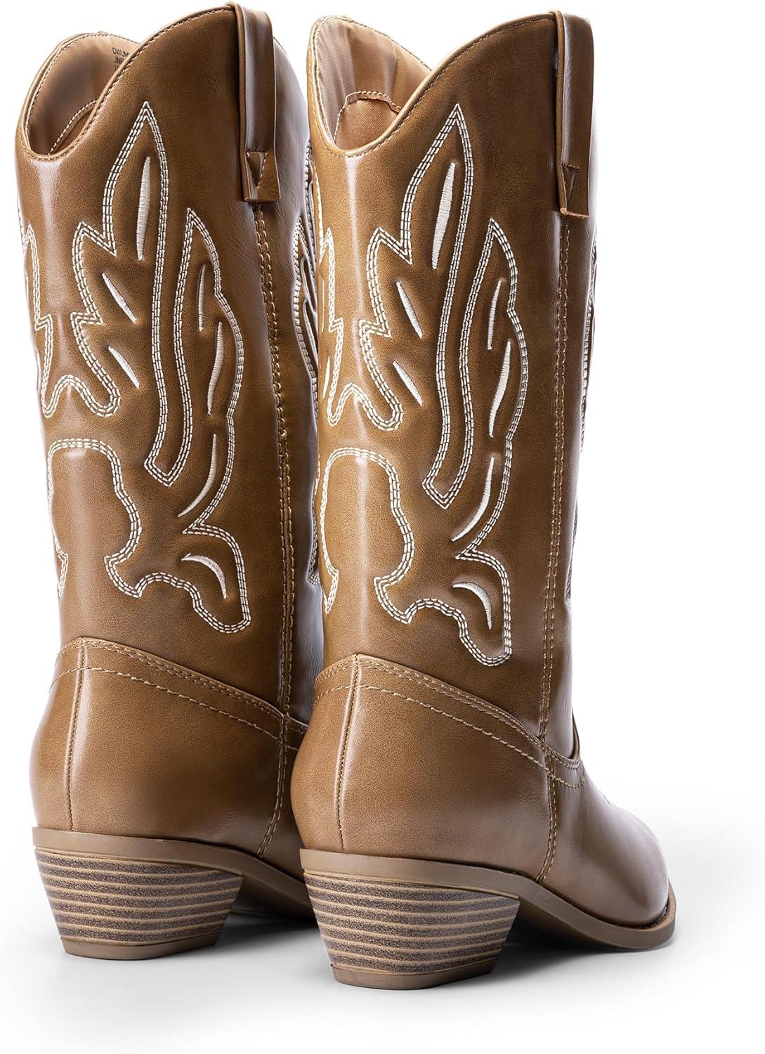 DREAM PAIRS Women’s Cowboy Boots Mid Calf Cowgirl Boots Embroidery Stitched Western Boots(Light Brown-pu)