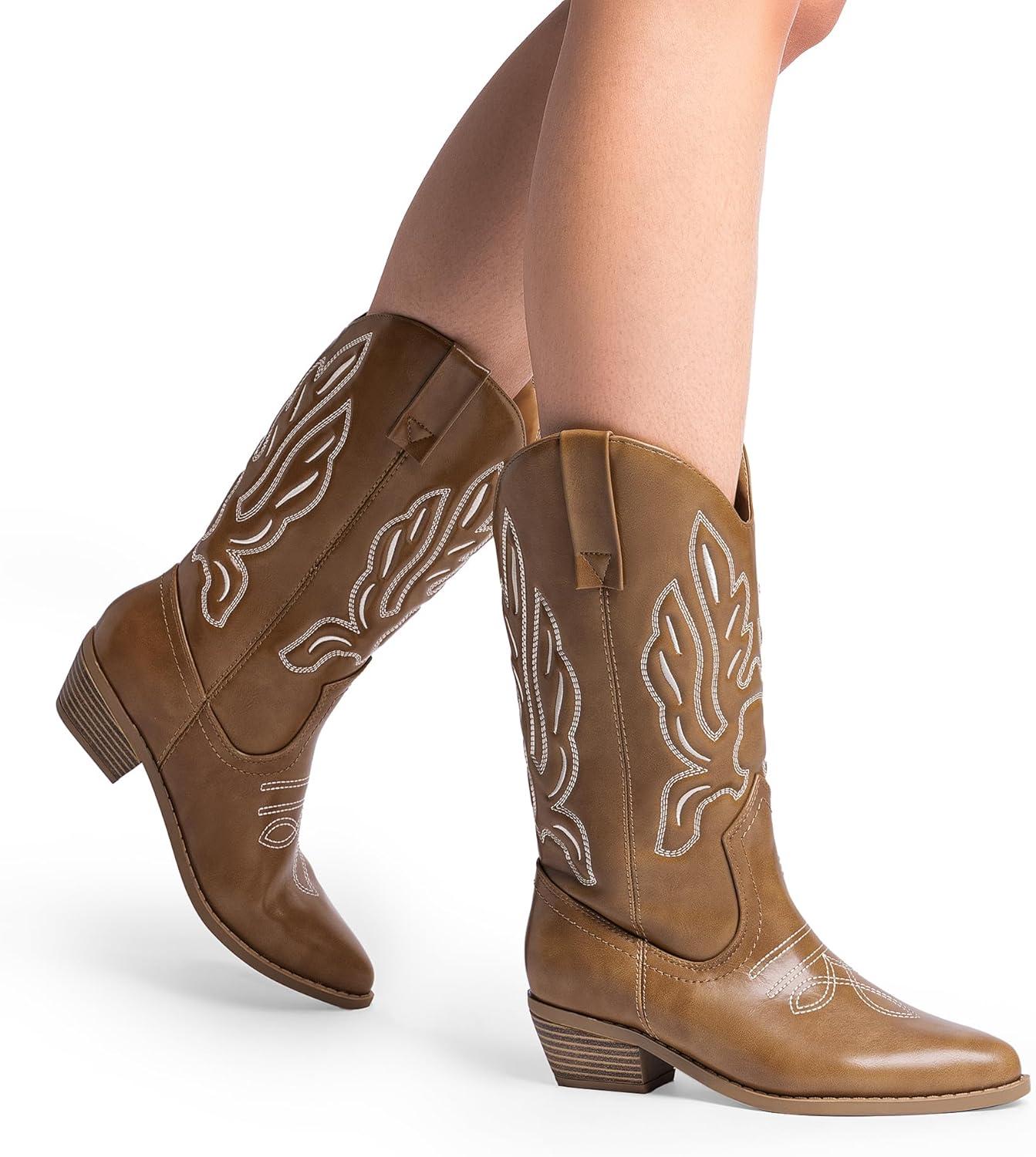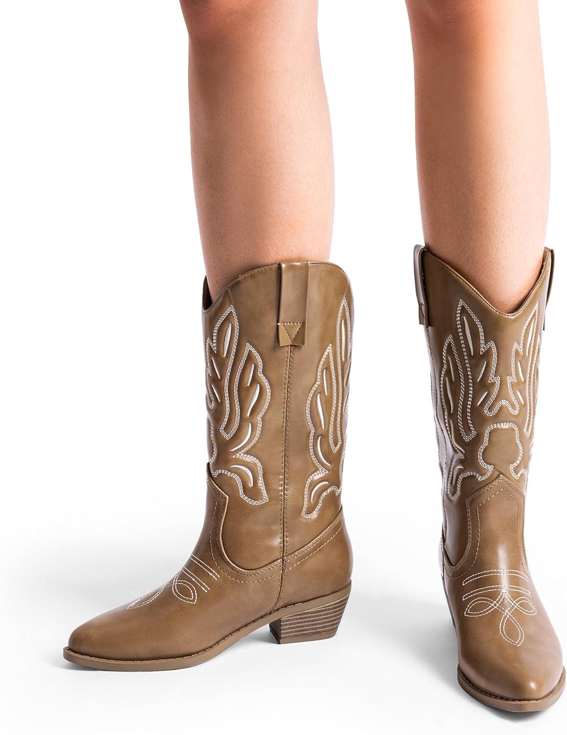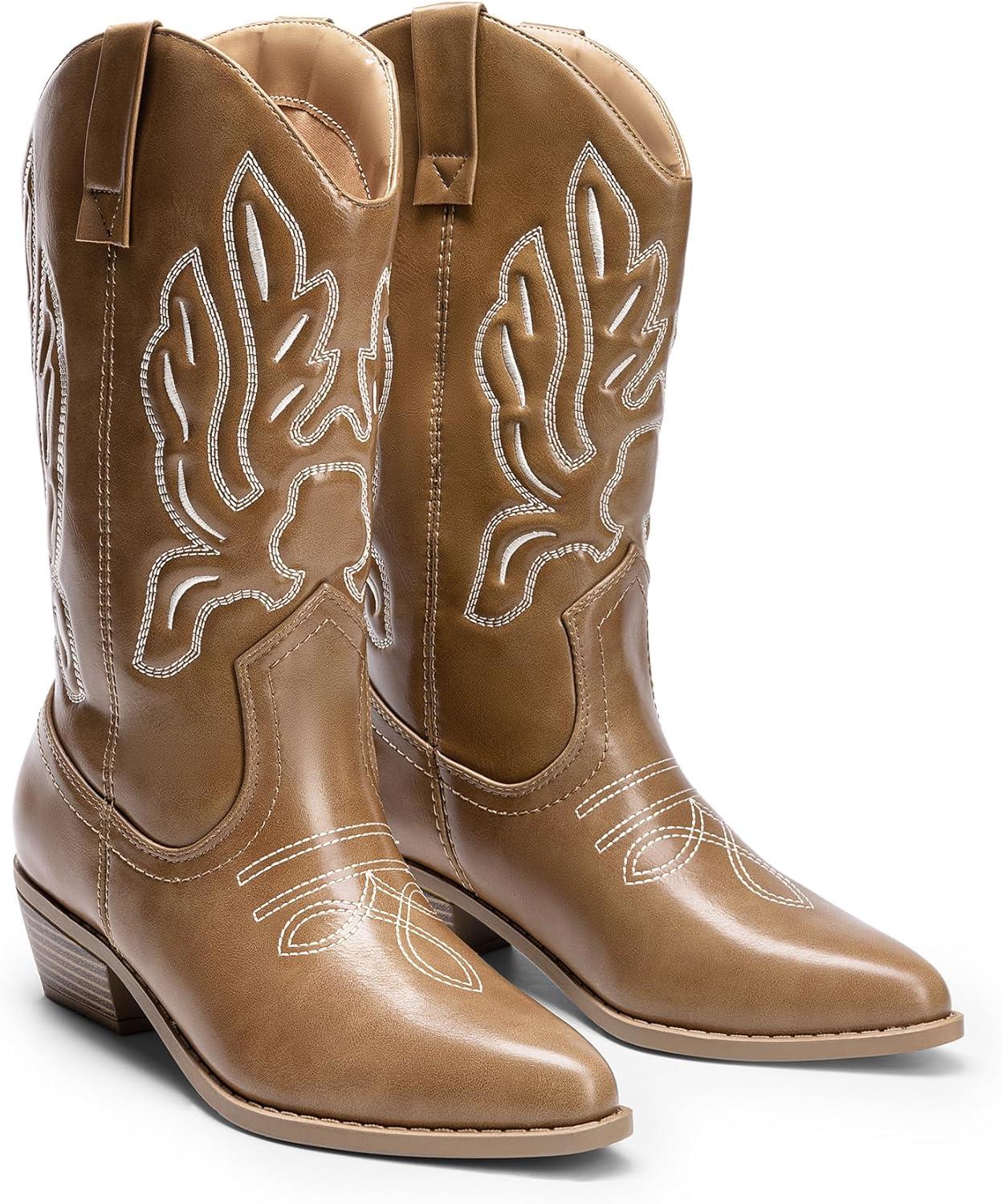 DREAM PAIRS Women’s Cowboy Boots Mid Calf Cowgirl Boots Embroidery Stitched Western Boots(Light Brown-pu)