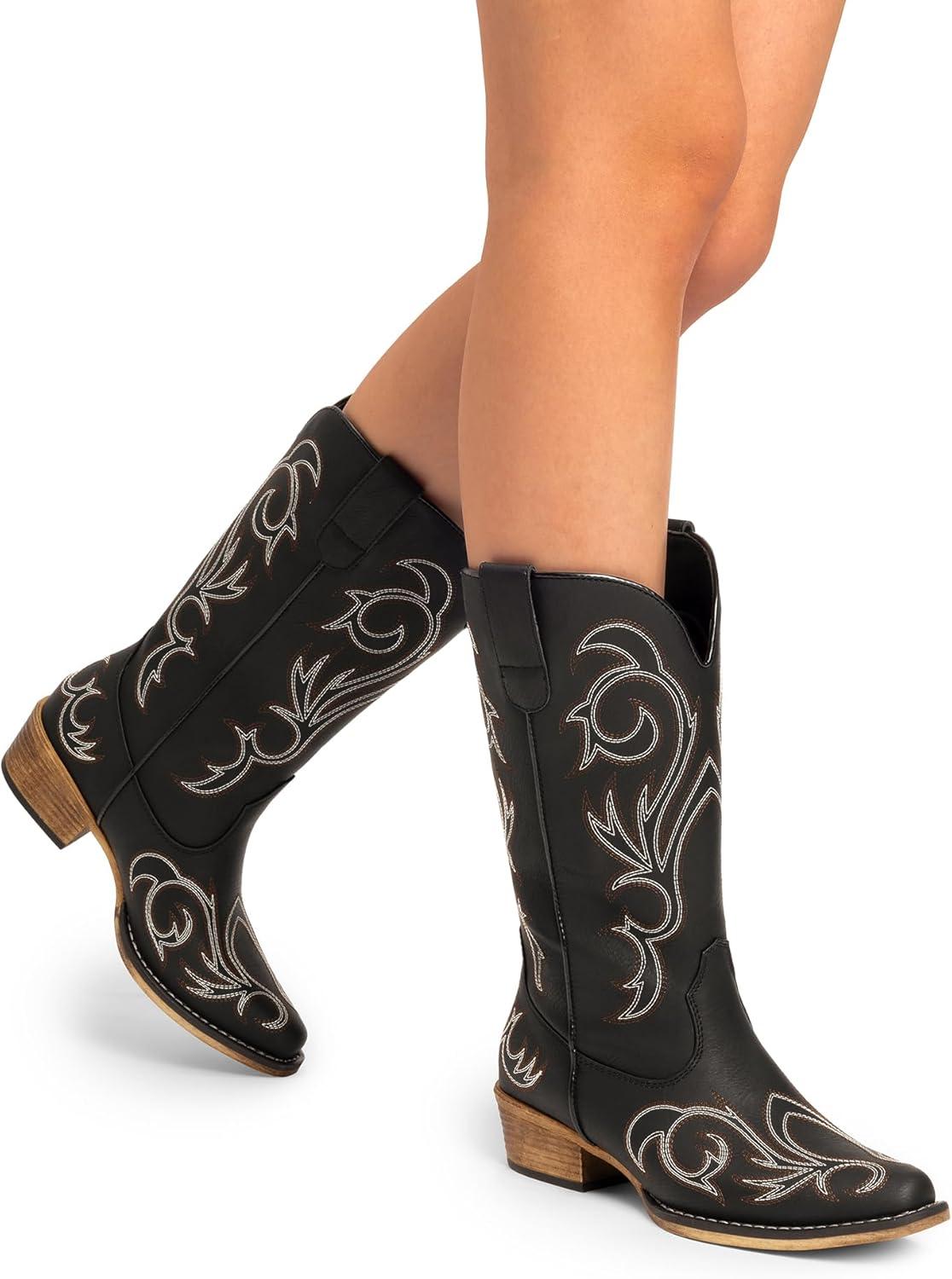 DREAM PAIRS Women’s Cowboy Boots Mid Calf Cowgirl Boots Square Toe Chunky Heel Embroidery Stitched Western Boots(Black)