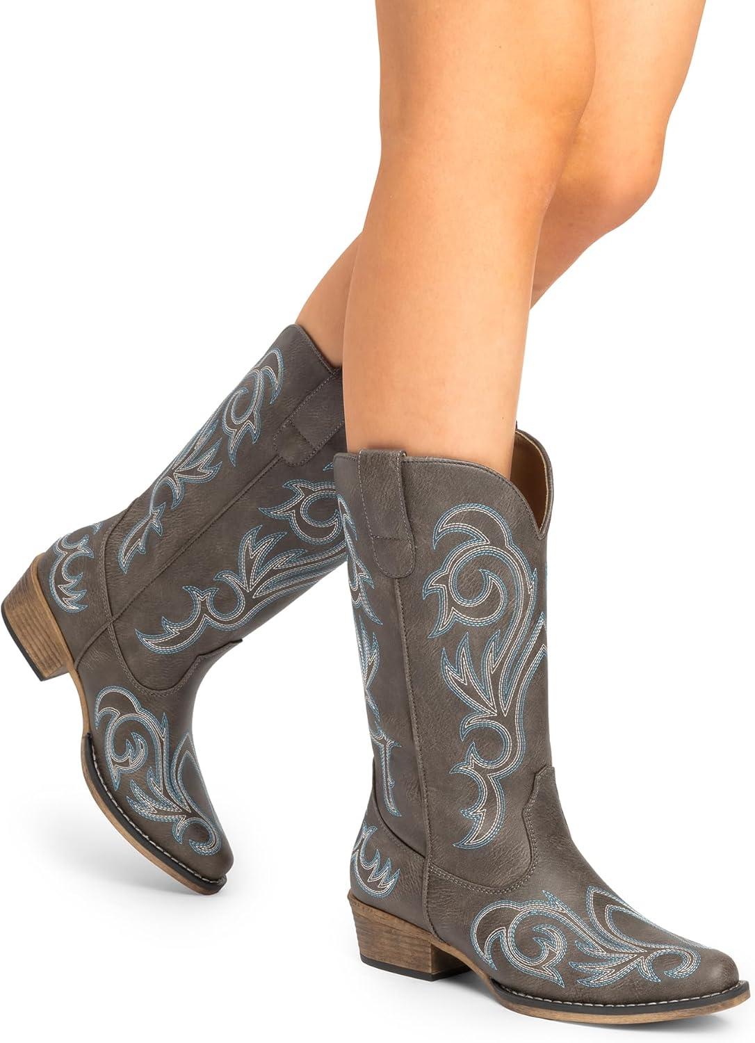 DREAM PAIRS Women’s Cowboy Boots Mid Calf Cowgirl Boots Square Toe Chunky Heel Embroidery Stitched Western Boots(Brown)