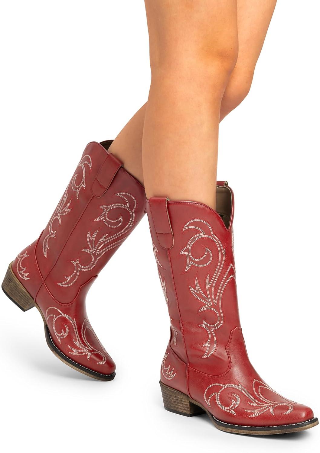 DREAM PAIRS Women’s Cowboy Boots Mid Calf Cowgirl Boots Square Toe Chunky Heel Embroidery Stitched Western Boots(Red)