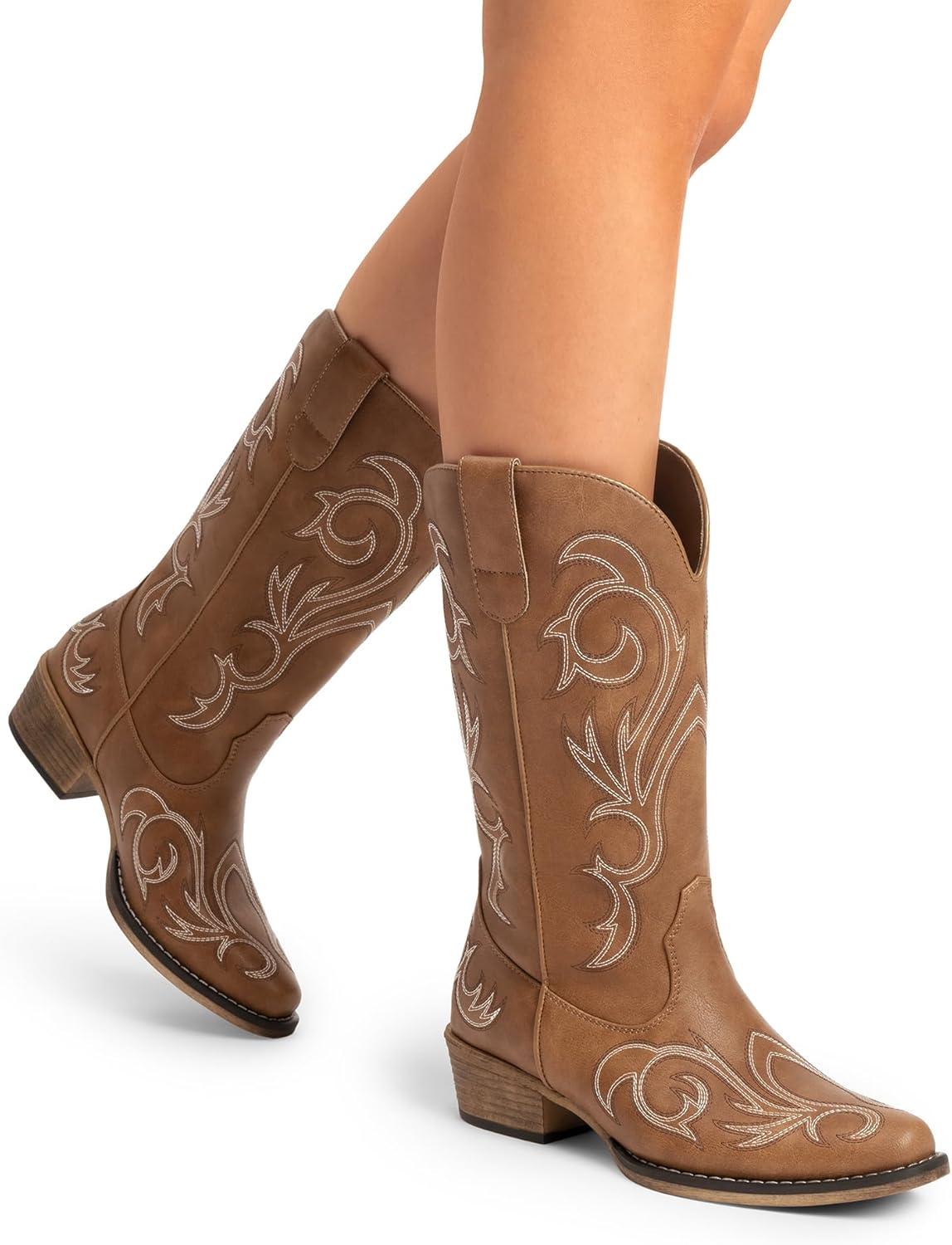 DREAM PAIRS Women’s Cowboy Boots Mid Calf Cowgirl Boots Square Toe Chunky Heel Embroidery Stitched Western Boots(Tan)