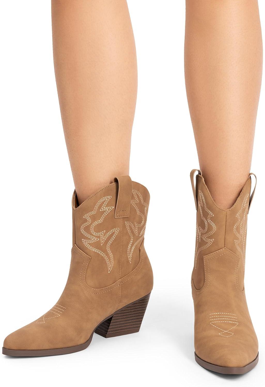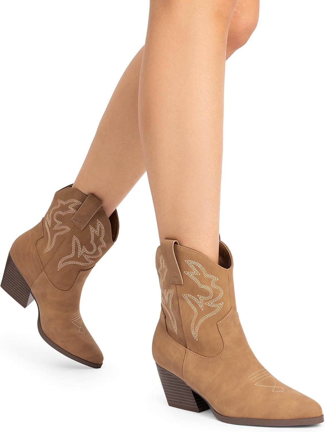DREAM PAIRS Women’s Cowboy Cowgirl Boots Embroidered Stitched Short Western Boots Low Chunky Heel Pointed Toe Ankle Booties(Tan)