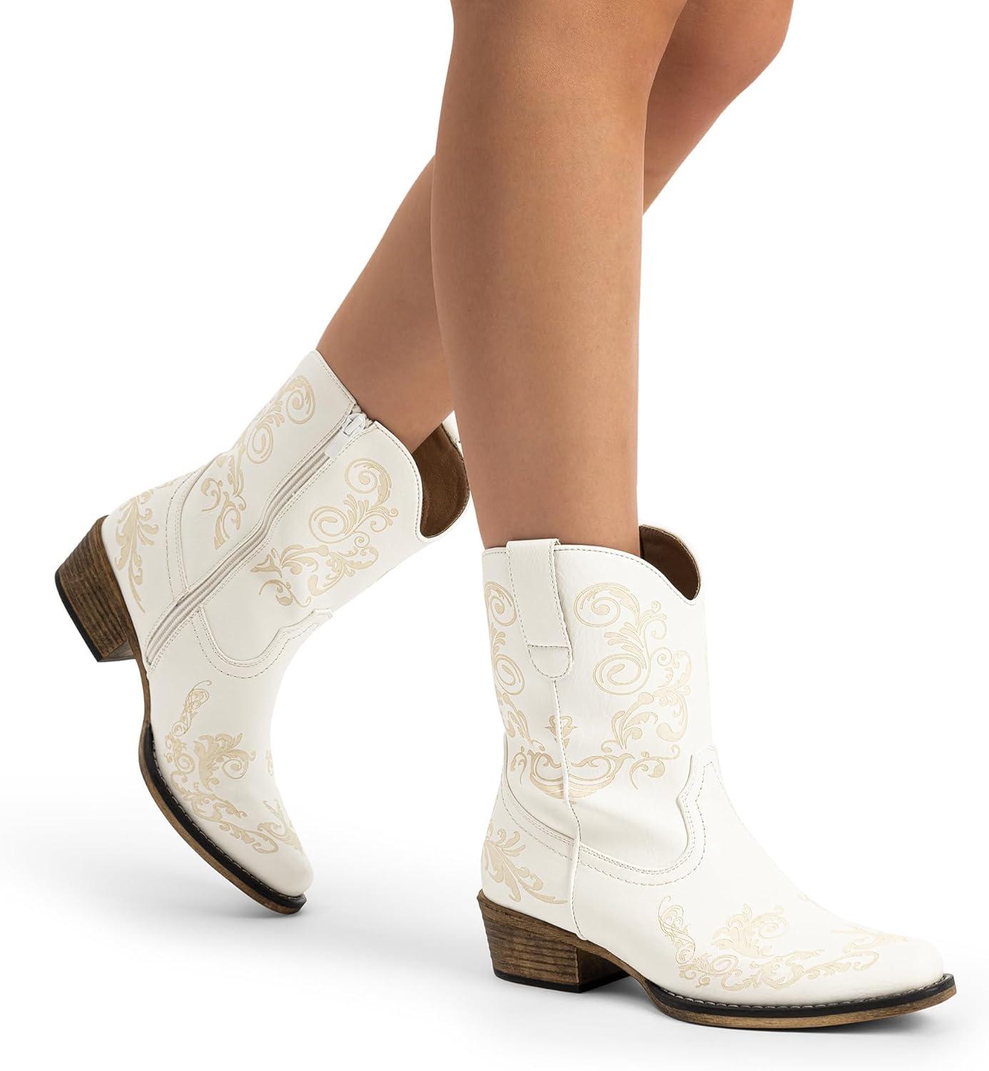 DREAM PAIRS Women’s Cowboy Cowgirl Western Ankle Boots Low Chunky Heels Square Toe Fall Short Booties Shoes(White)