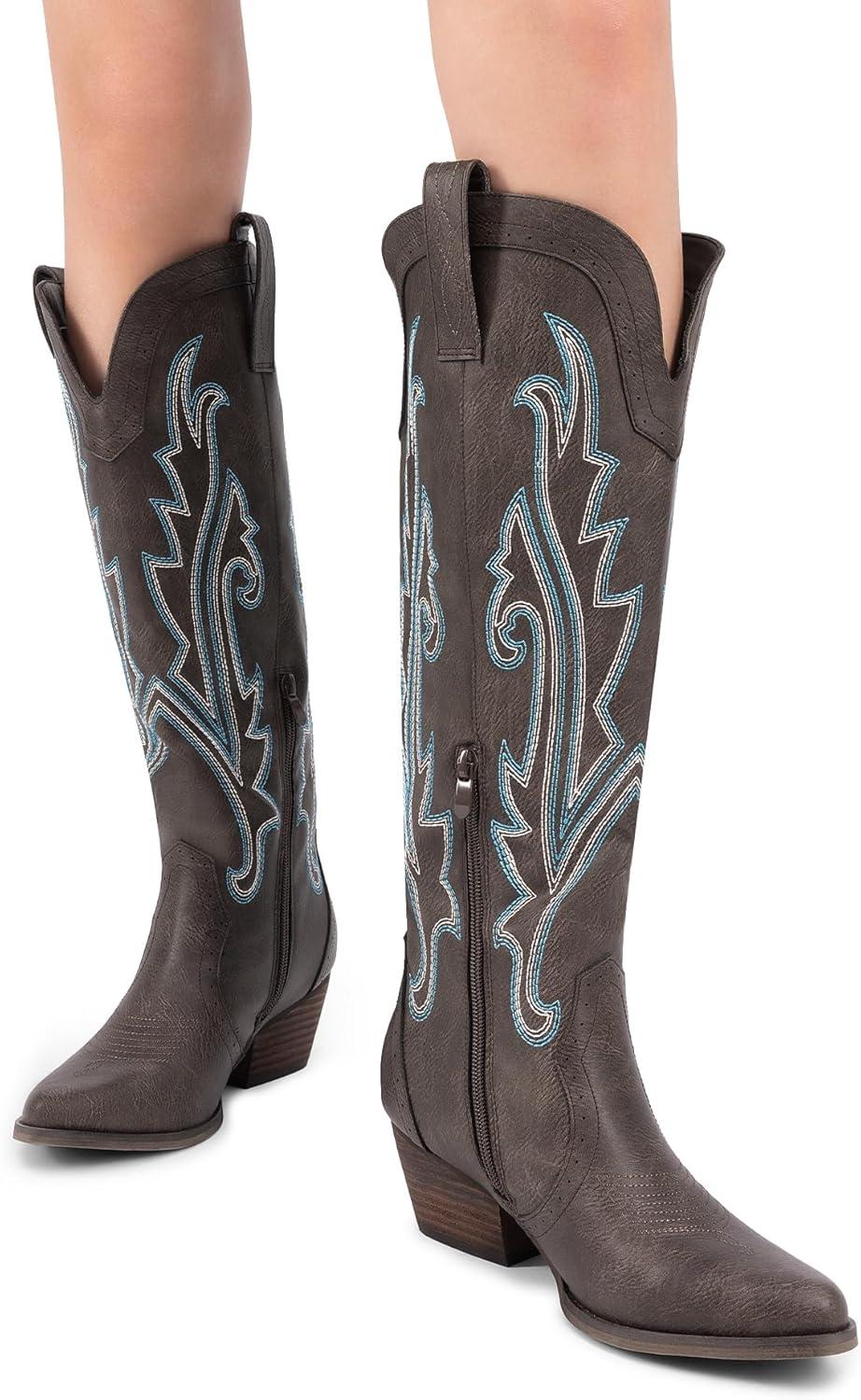 DREAM PAIRS Womens Cowboy Knee High Boots Comfortable Pull On Side Zipper Chunky Heel Embroidered Western Cowgirl Boots Retro Tall Boot(Brown)