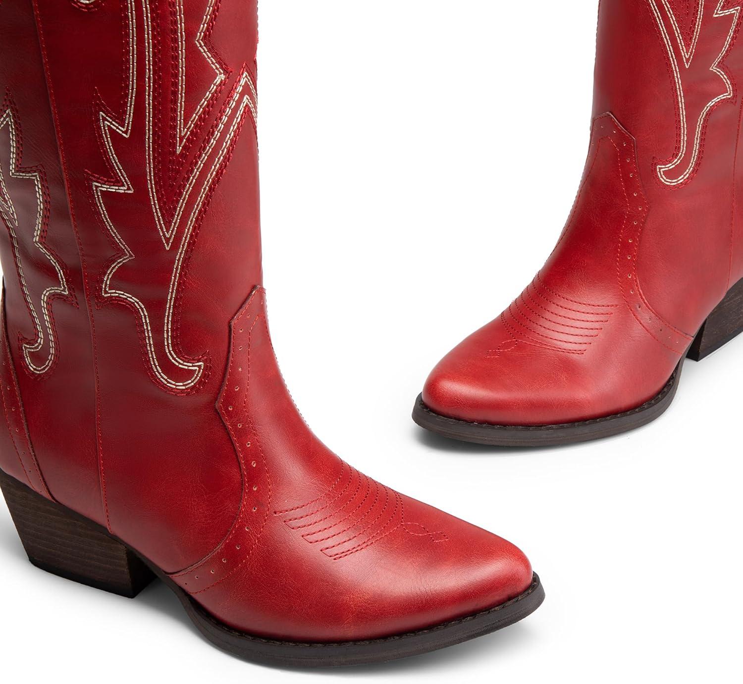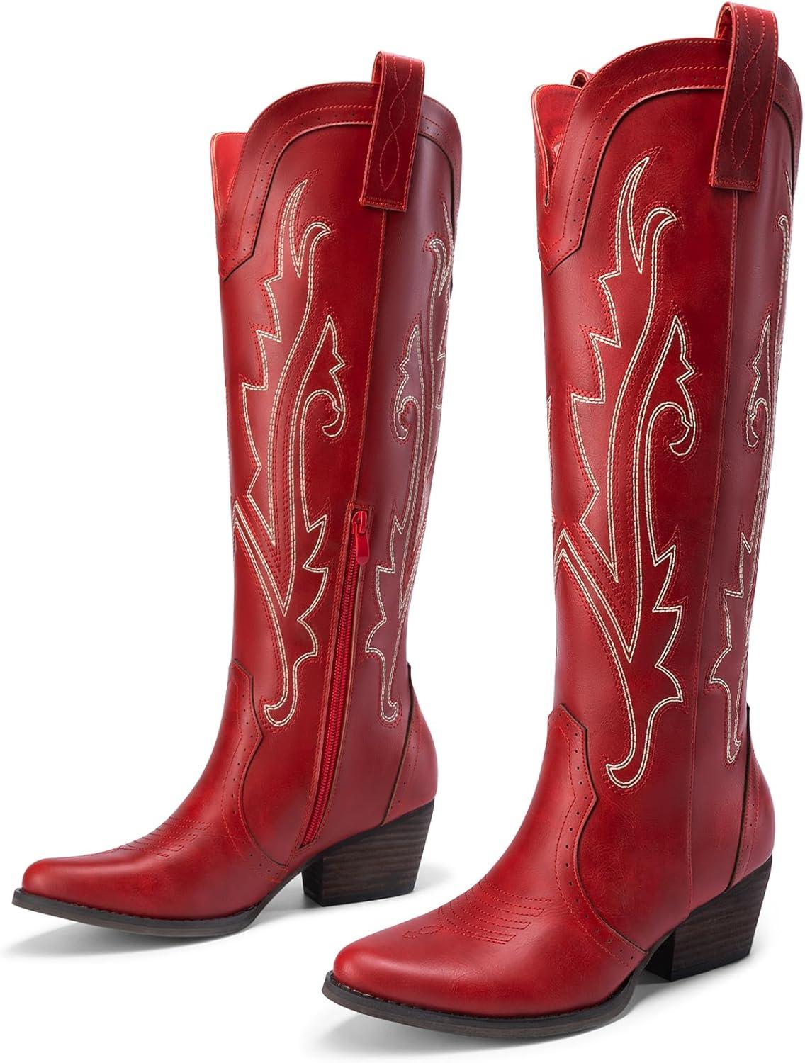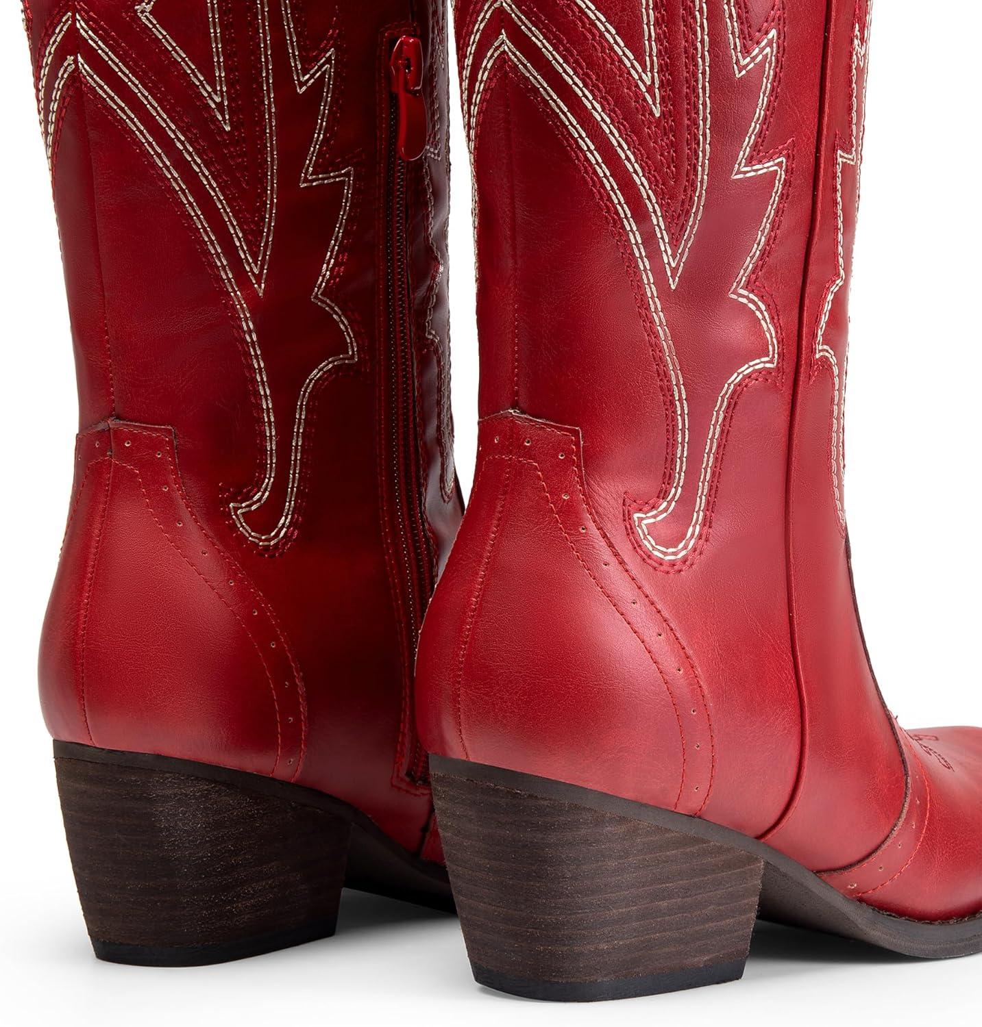 DREAM PAIRS Womens Cowboy Knee High Boots Comfortable Pull On Side Zipper Chunky Heel Embroidered Western Cowgirl Boots Retro Tall Boot(Red)