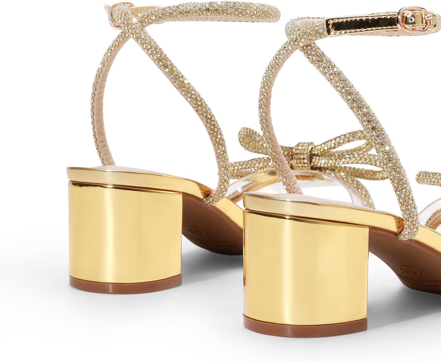 DREAM PAIRS Women’s Double Bowknots Crystal Sandals Low Chunky Heels Clear Slingback Dress Shoes for Wedding Bridal Party(Gold)