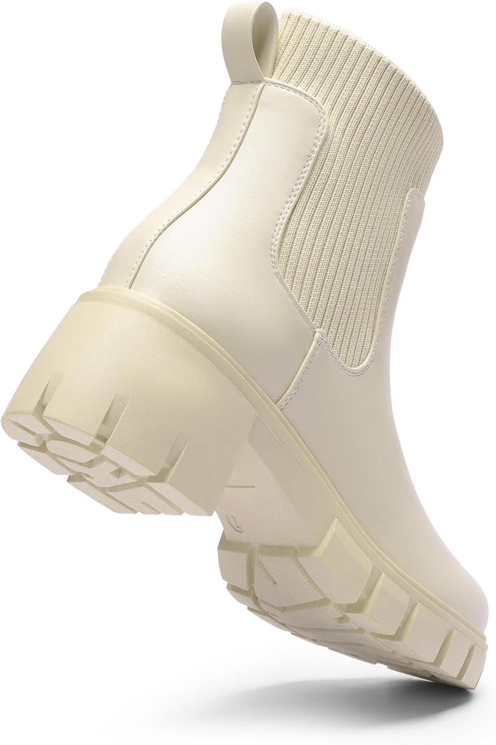 DREAM PAIRS Women’s Elastic Chelsea Ankle Boots Fashion Low Chunky Heel Platform Lug Sole Short Booties Shoes(Beige)