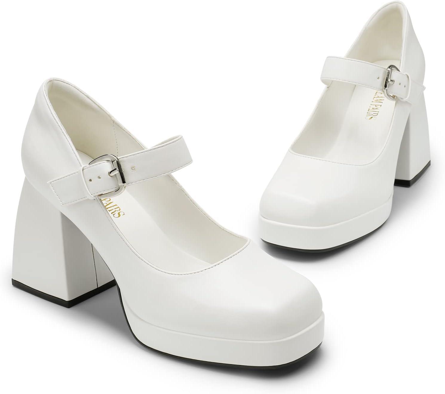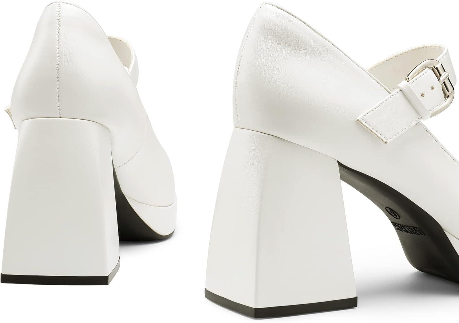 DREAM PAIRS Women’s High Chunky Platform Closed Toe Mary Jane Block Heels Square Toe Strappy Dress Wedding Party Pumps Shoes(White-pu)