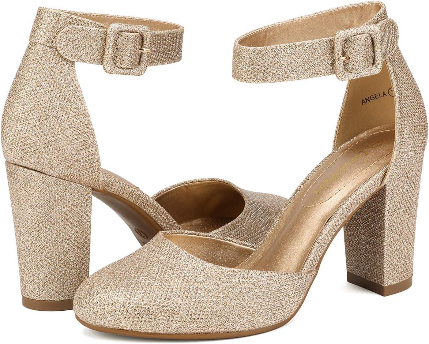 DREAM PAIRS Women’s High Heel Ankle Strap Closed Toe Chunky Wedding Pumps Shoes(Gold/Glitter)