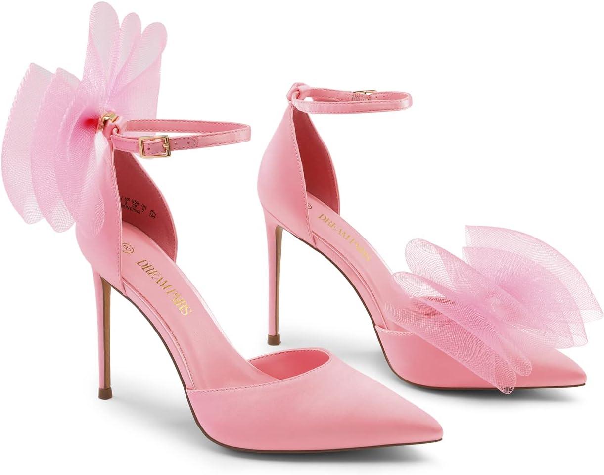 DREAM PAIRS Women’s High Heels Strappy Closed Toe Stiletto Pointed Toe Mesh Bows Ankle Strap D’Orsay Sexy Dress Wedding Party Pumps Shoes(Pink)