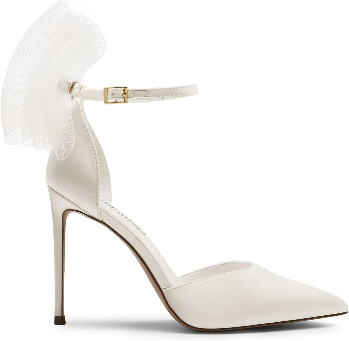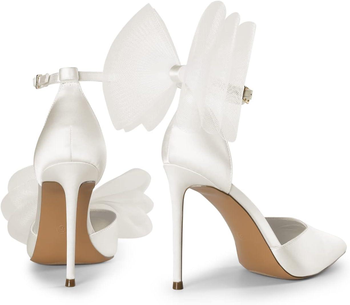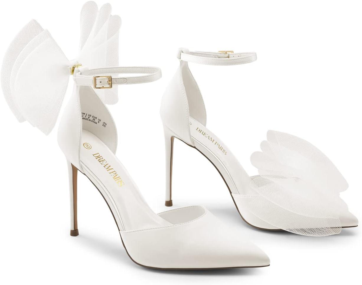 DREAM PAIRS Women’s High Heels Strappy Closed Toe Stiletto Pointed Toe Mesh Bows Ankle Strap D’Orsay Sexy Dress Wedding Party Pumps Shoes(White)