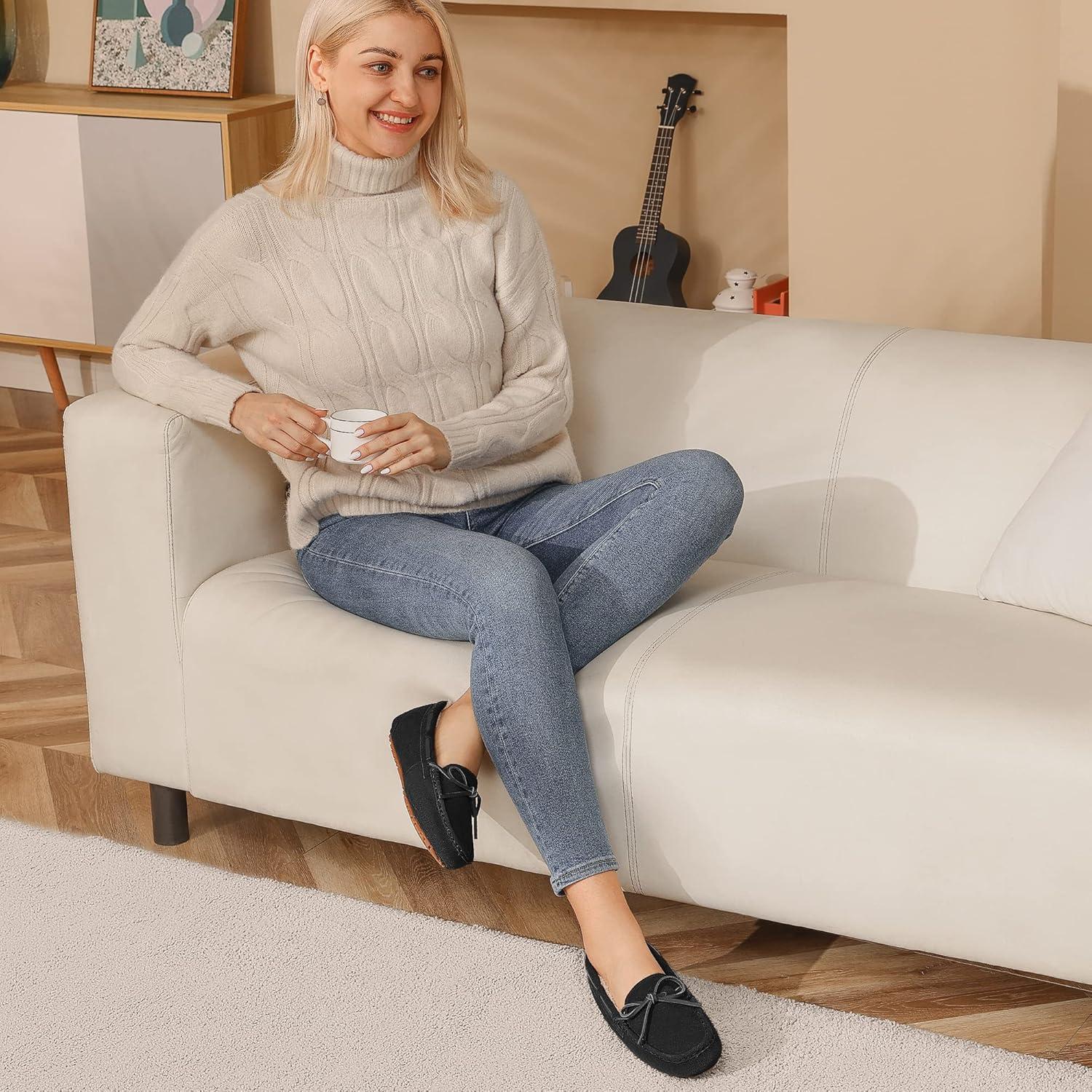 DREAM PAIRS Women’s House Slippers Indoor Outdoor Moccasin Fuzzy Fluffy Furry Loafers Suede Leather Warm Shoes(Black)