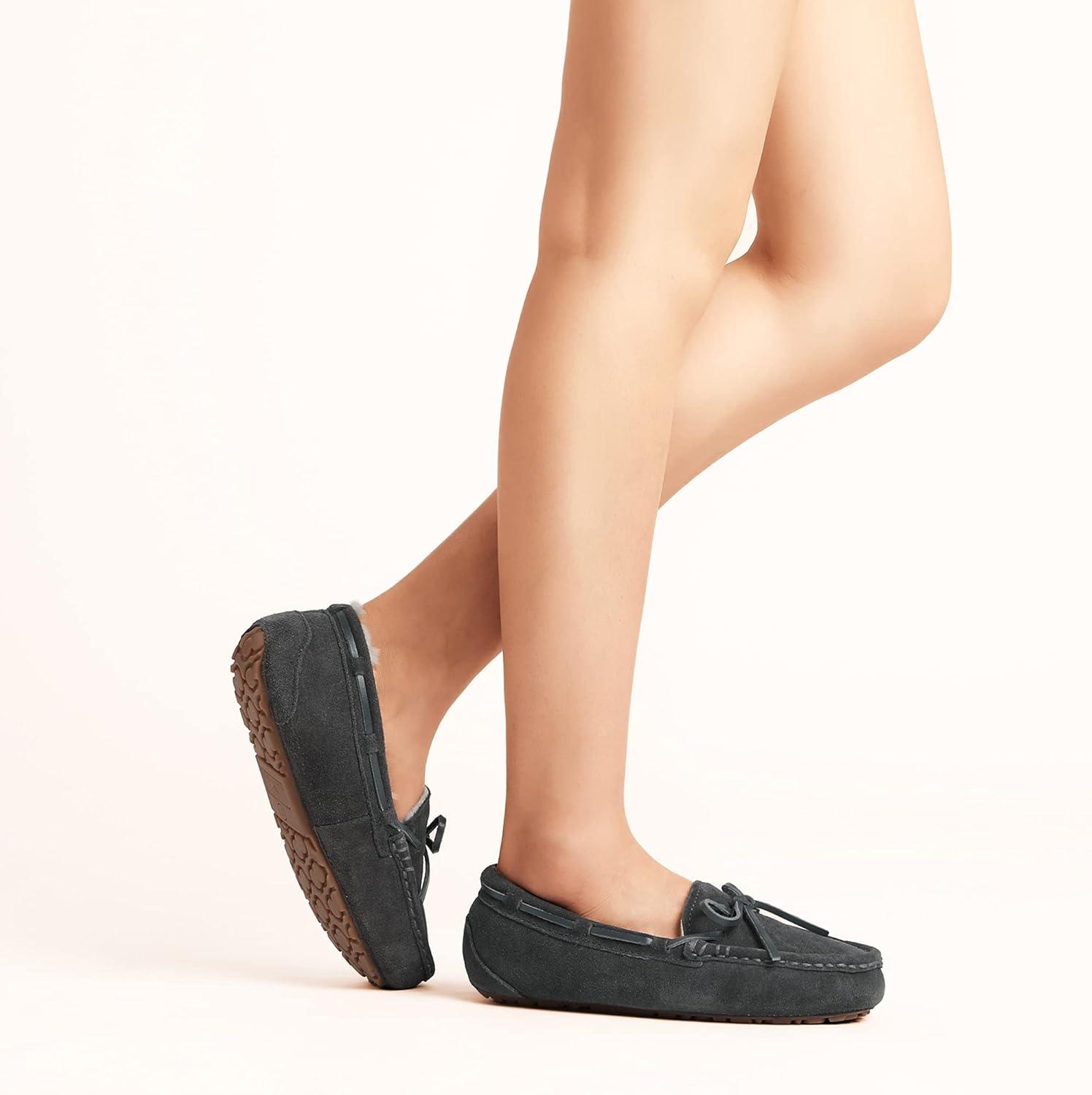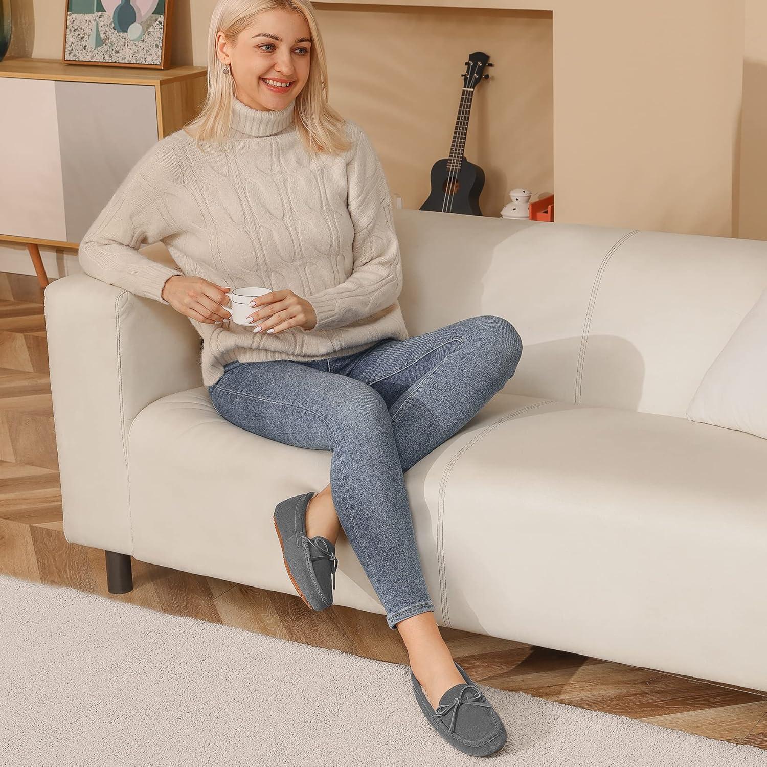 DREAM PAIRS Women’s House Slippers Indoor Outdoor Moccasin Fuzzy Fluffy Furry Loafers Suede Leather Warm Shoes(Grey)