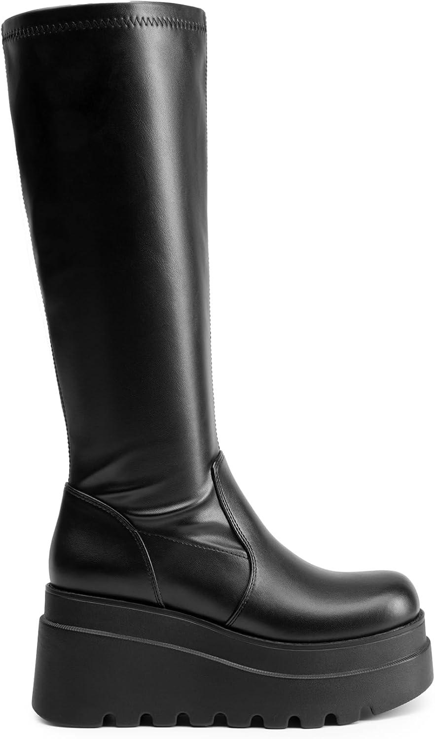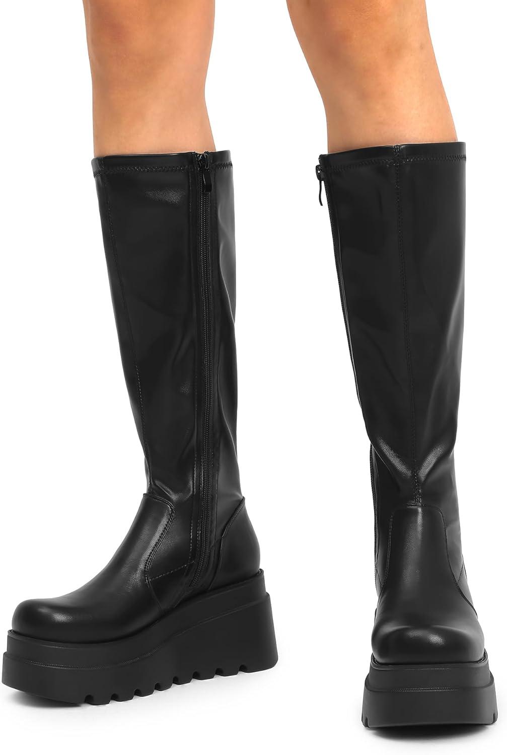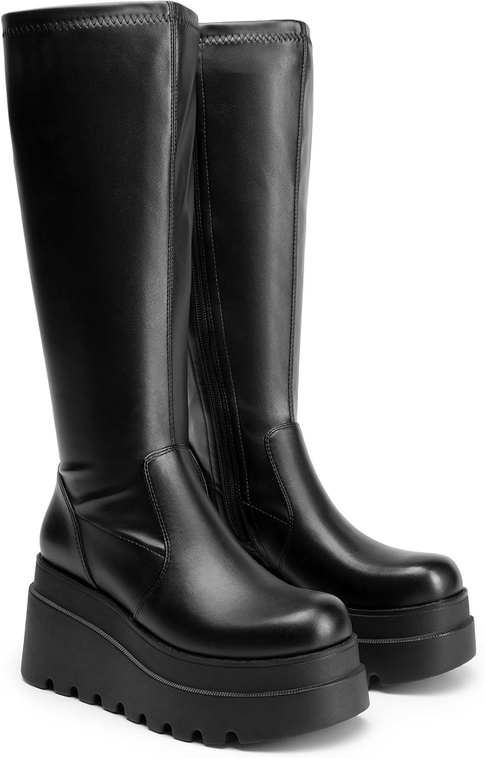 DREAM PAIRS Women’s Knee High Boots Wedge Platform Chunky Heel Round Toe Side Zipper Fashion Long Tall Sock Punk Goth Boots for Women(Black-pu)