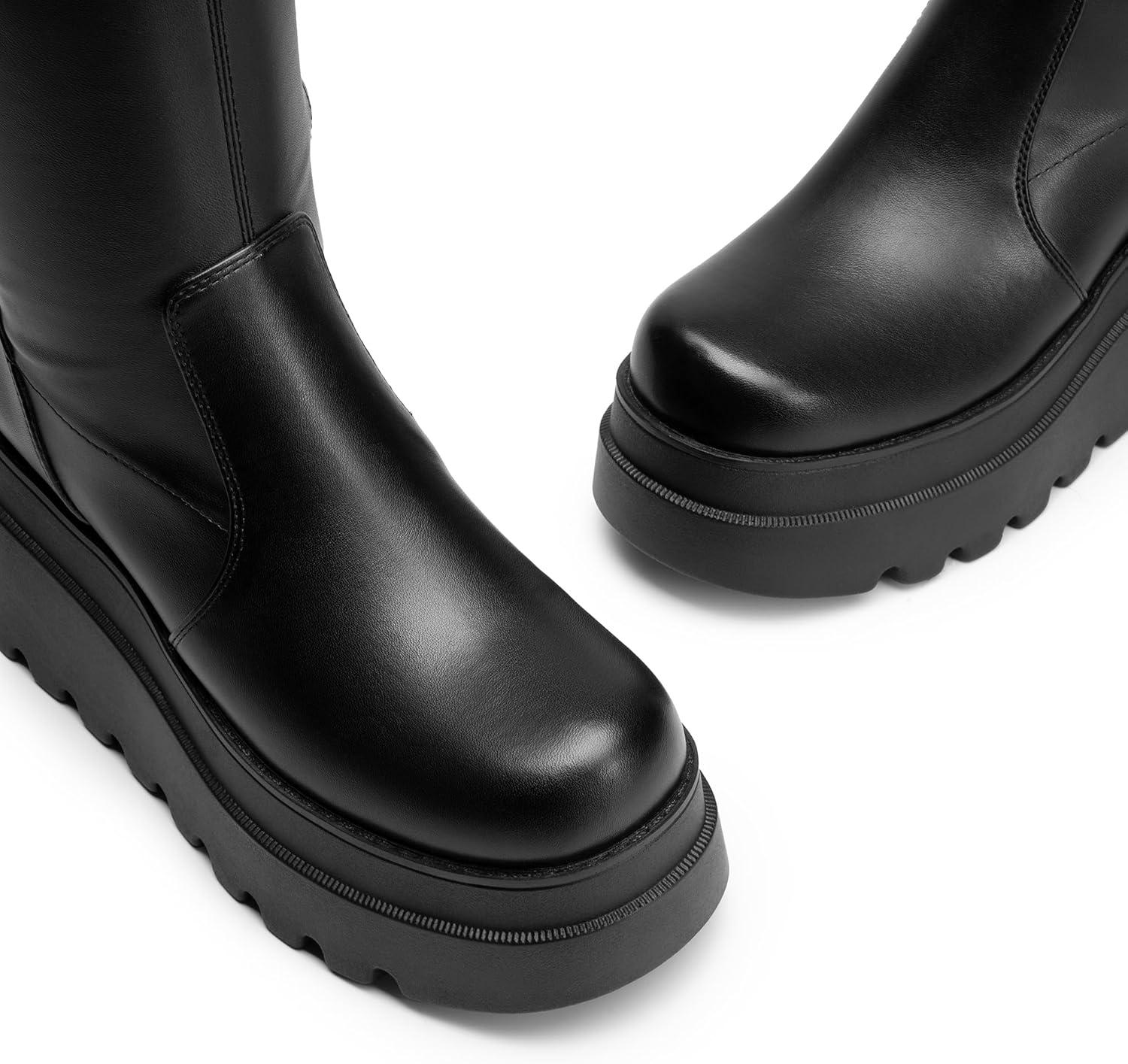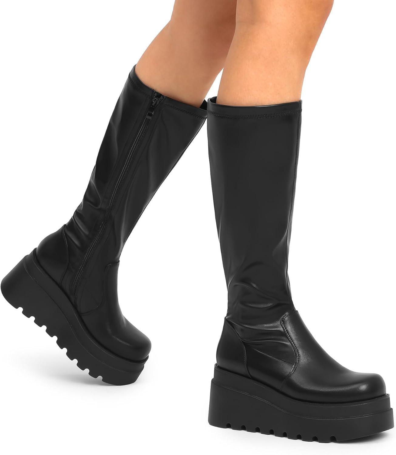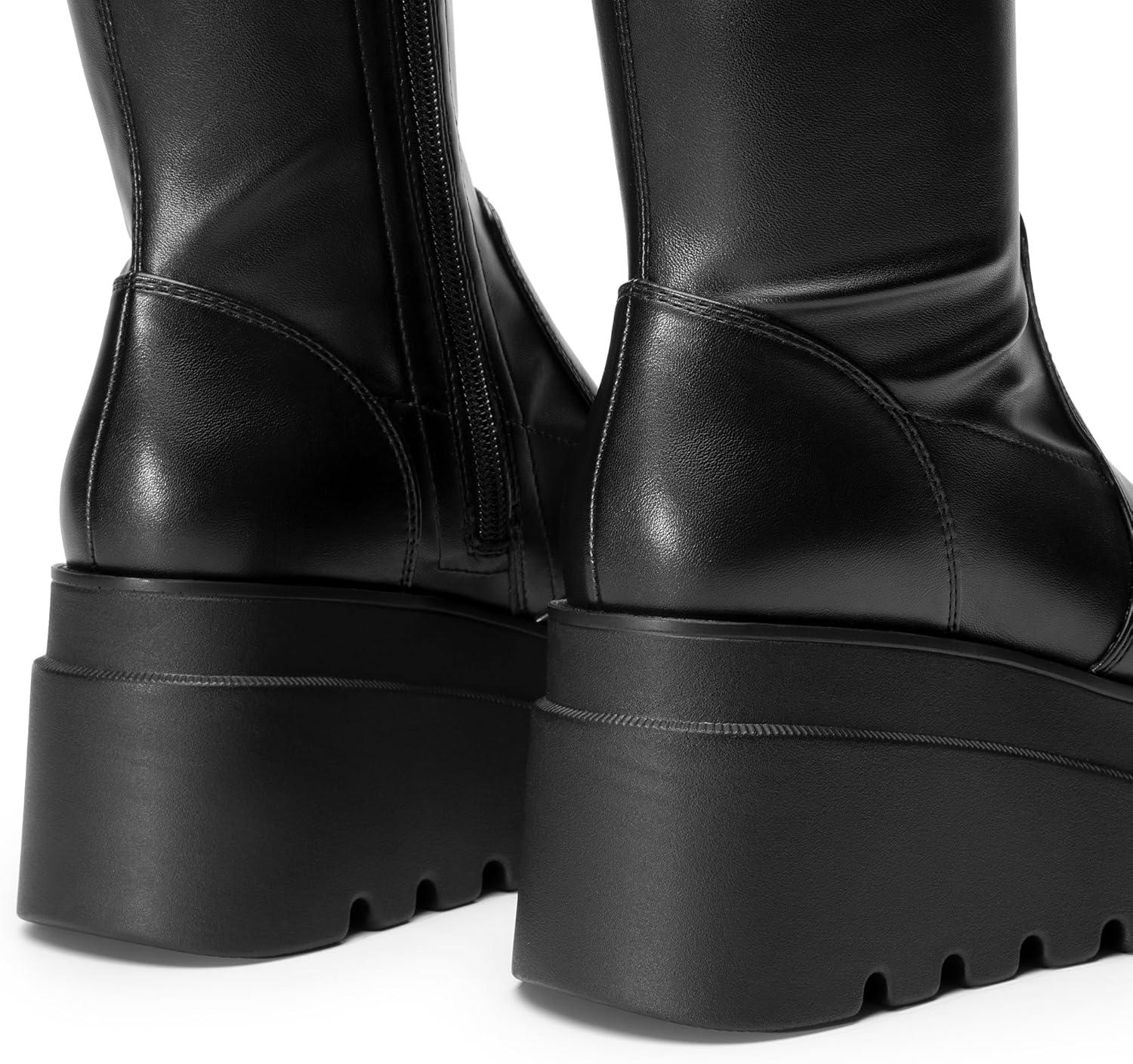 DREAM PAIRS Women’s Knee High Boots Wedge Platform Chunky Heel Round Toe Side Zipper Fashion Long Tall Sock Punk Goth Boots for Women(Black-pu)