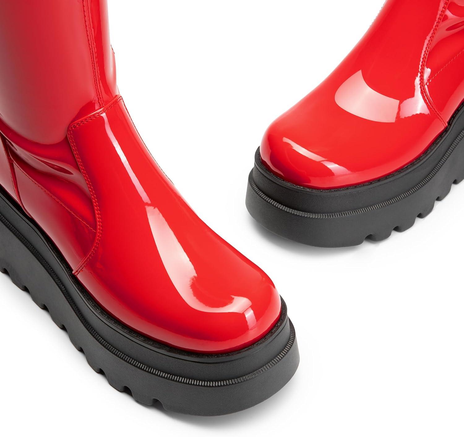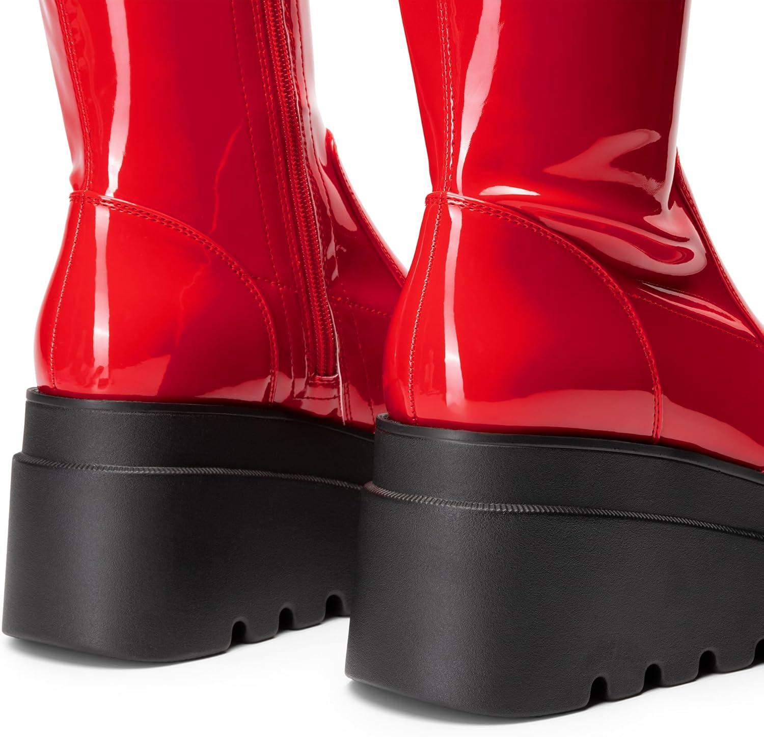 DREAM PAIRS Women’s Knee High Boots Wedge Platform Chunky Heel Round Toe Side Zipper Fashion Long Tall Sock Punk Goth Boots for Women(Red-pat)