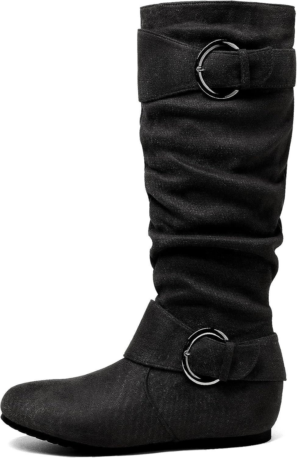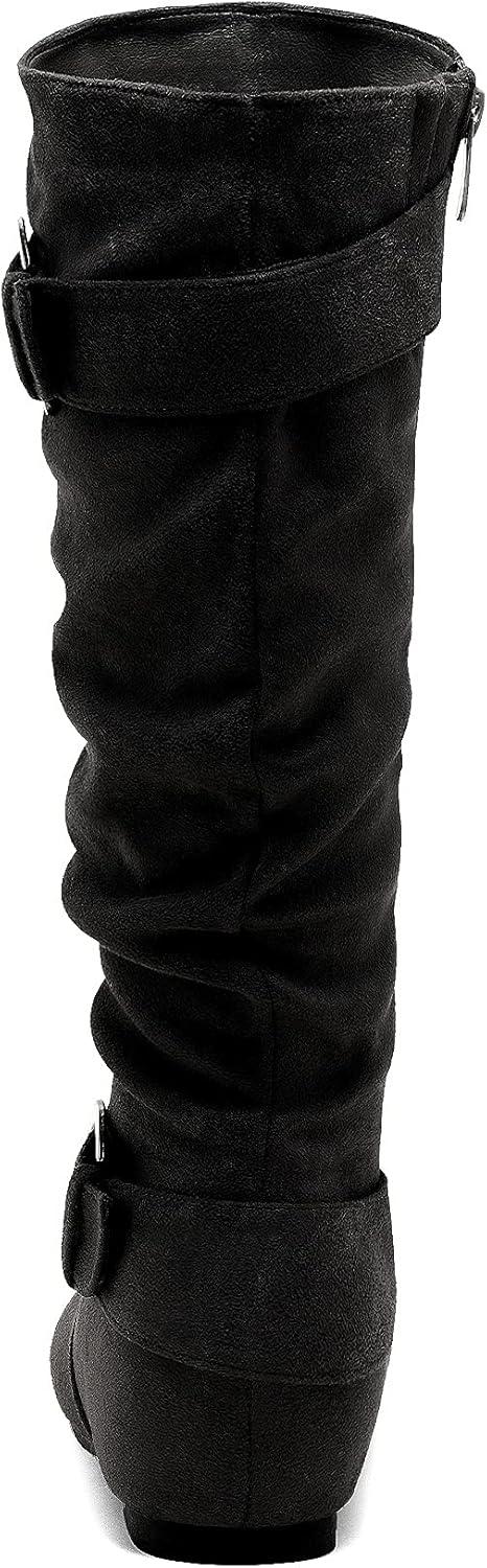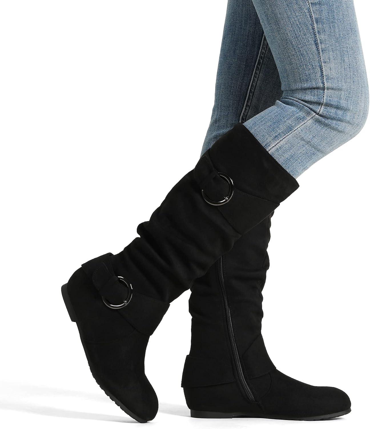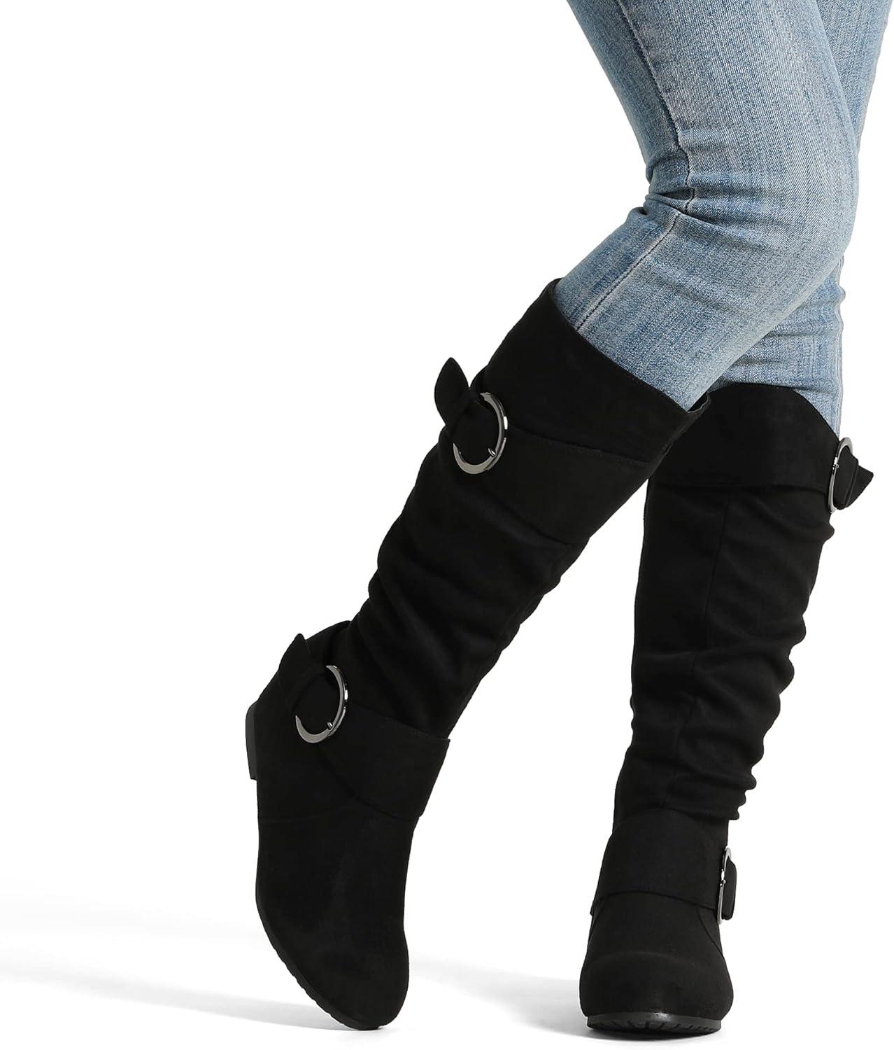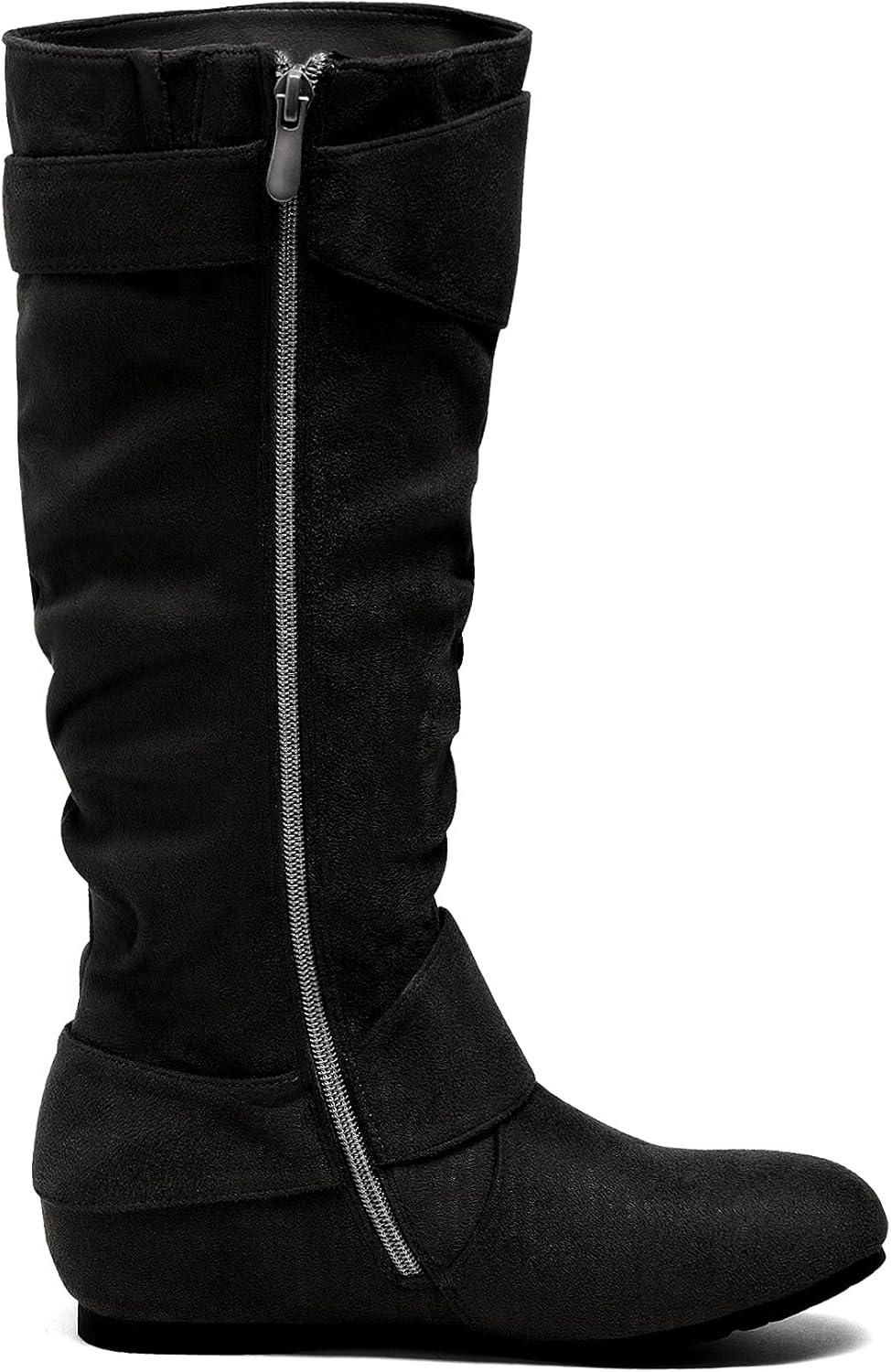 DREAM PAIRS Women’s Knee High Low Hidden Wedge Boots Suede Faux Fur Lining Side Zipper Knee High Buckle Boots(Black/Suede)