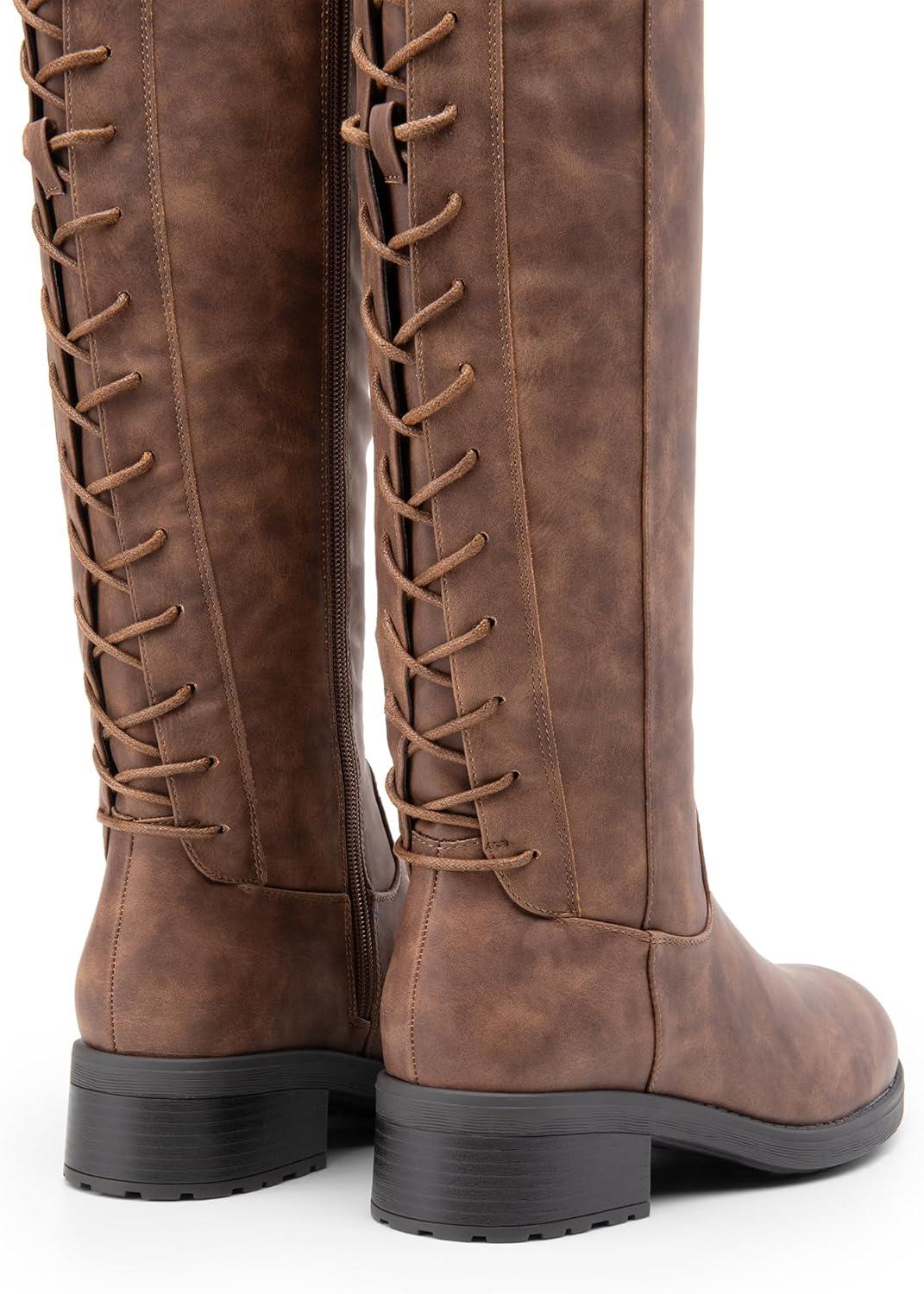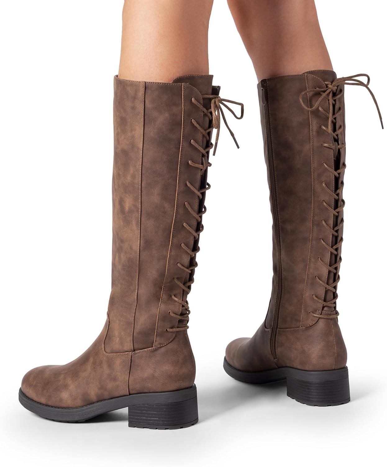 DREAM PAIRS Women’s Lace Up Back Knee High Fashion Boots Low Block Heel Riding Boots Round Toe Side Zipper Fall Boots(Tan-nubuck)