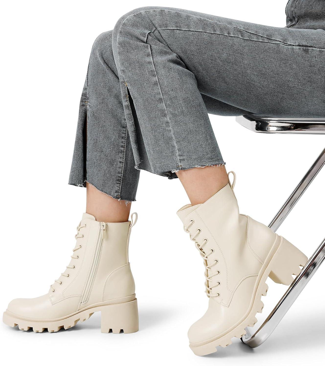 DREAM PAIRS Women’s Lace Up Combat Ankle Boots Fashion Low Chunky Heel Lug Sole Fall Heeled Booties Shoes(Beige)