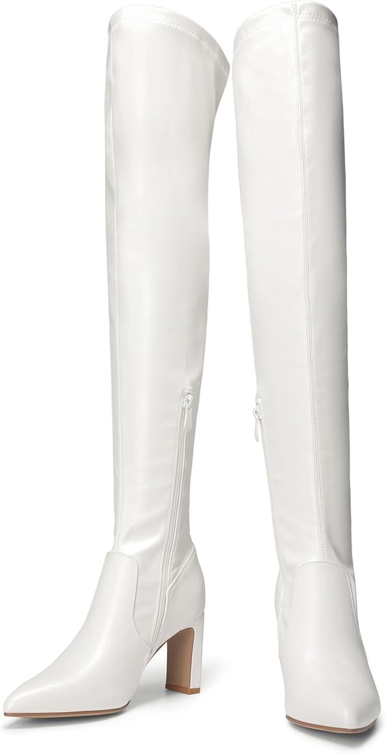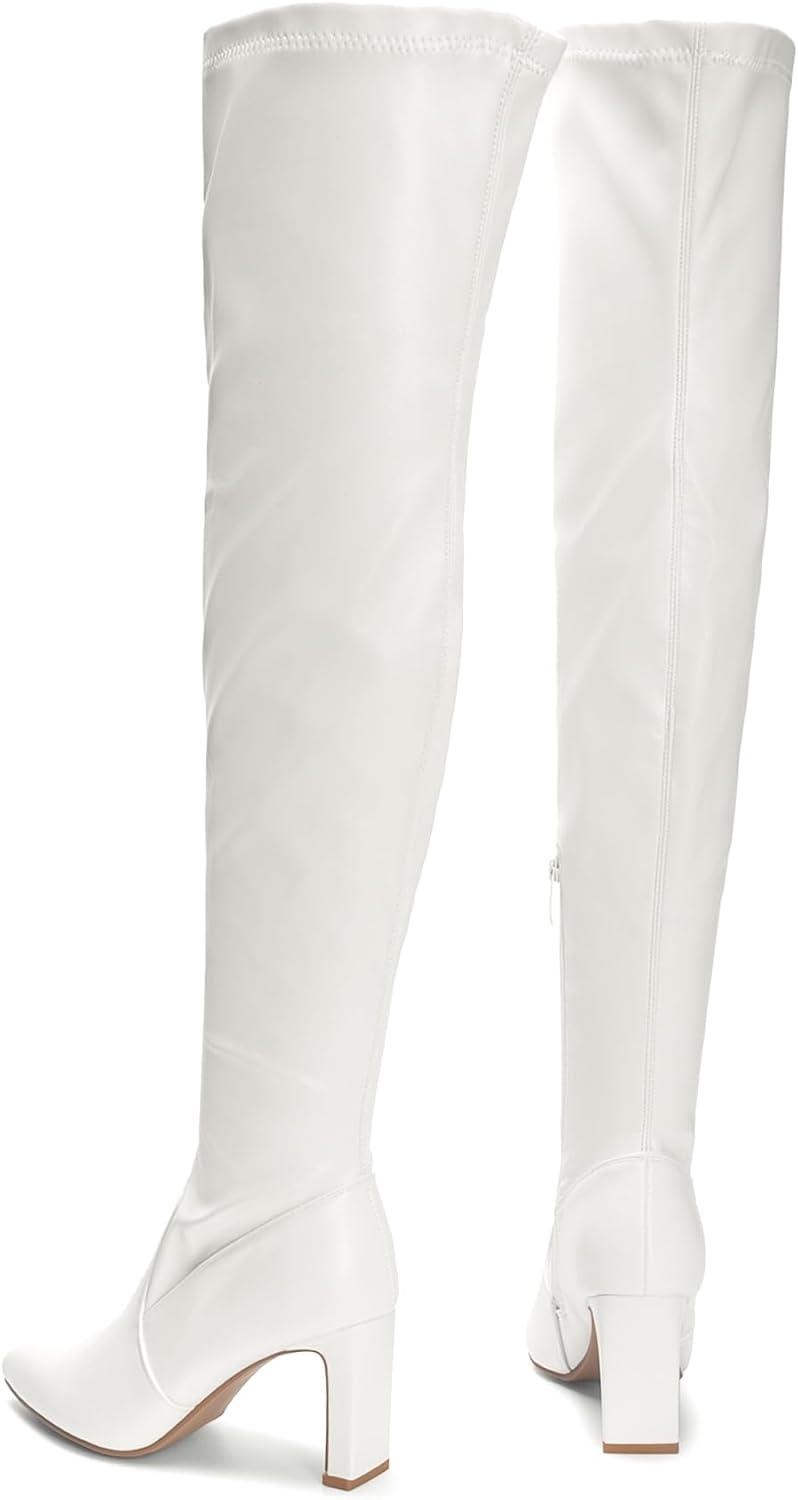 DREAM PAIRS Women’s Over The Knee Stretch Thigh High Boots Chunky High Heels Pointed Toe Long Fall Boots(White-pu)