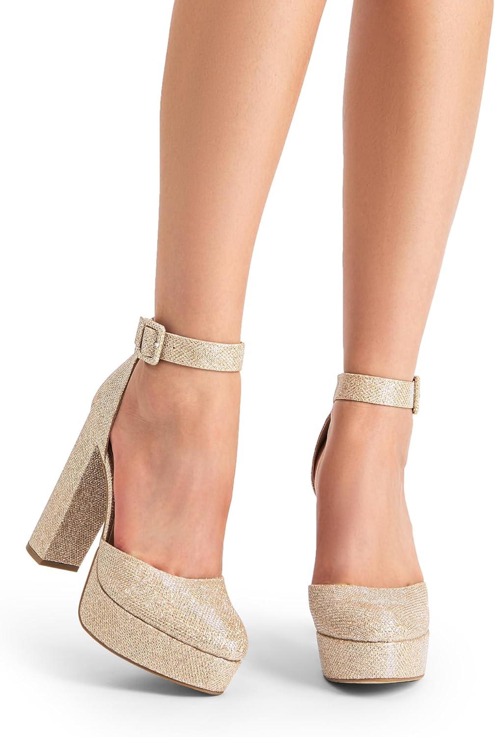 DREAM PAIRS Women’s Platform High Chunky Heels Closed Toe Block Ankle Strap Dress Buckle Round Toe Wedding Party Comfortable Pumps Shoes(Gold-glitter)