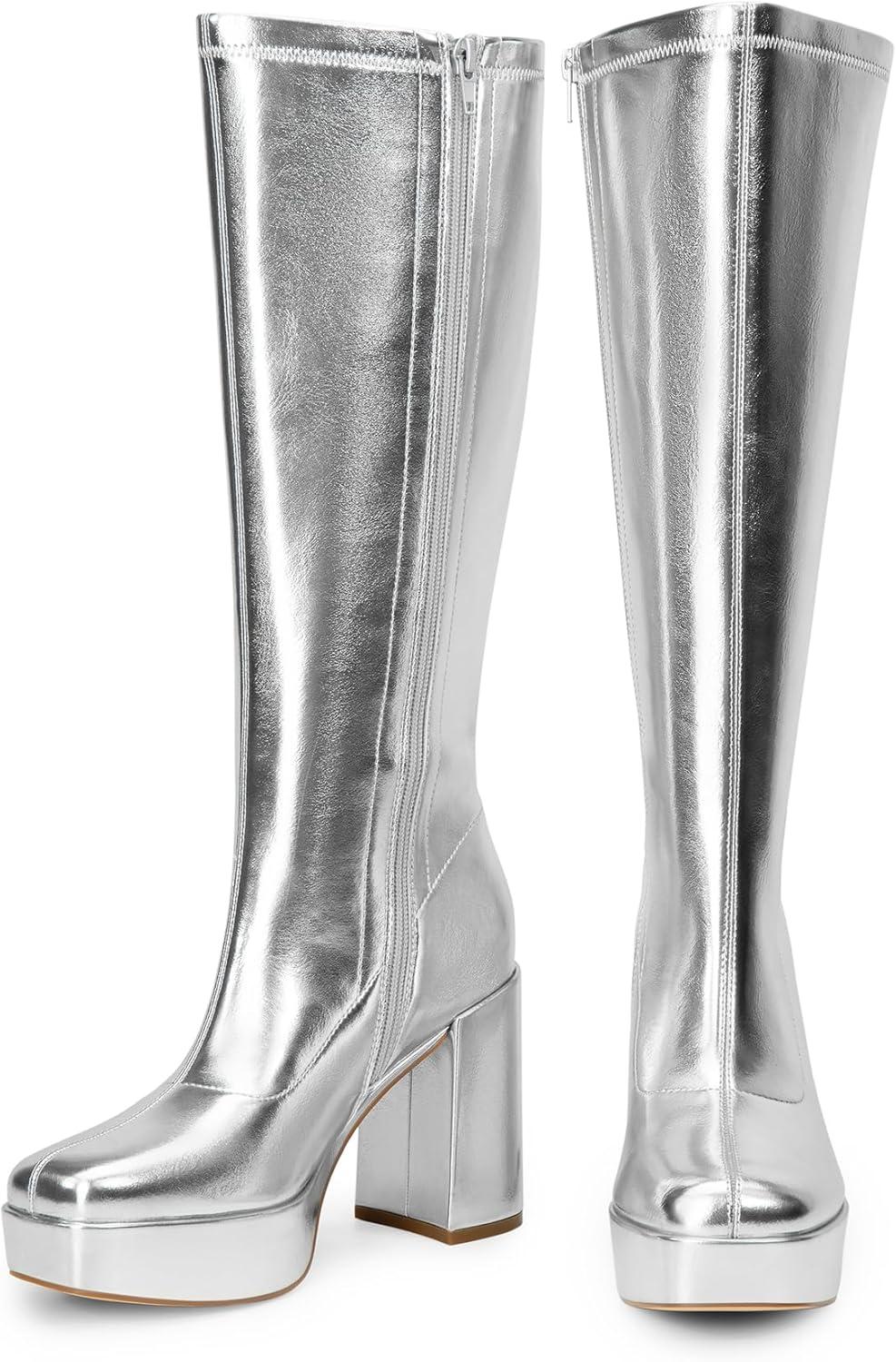 DREAM PAIRS Women’s Platform Knee High Boots Chunky Block Heel Side Zipper Cute Gogo Boots(Silver-pu)