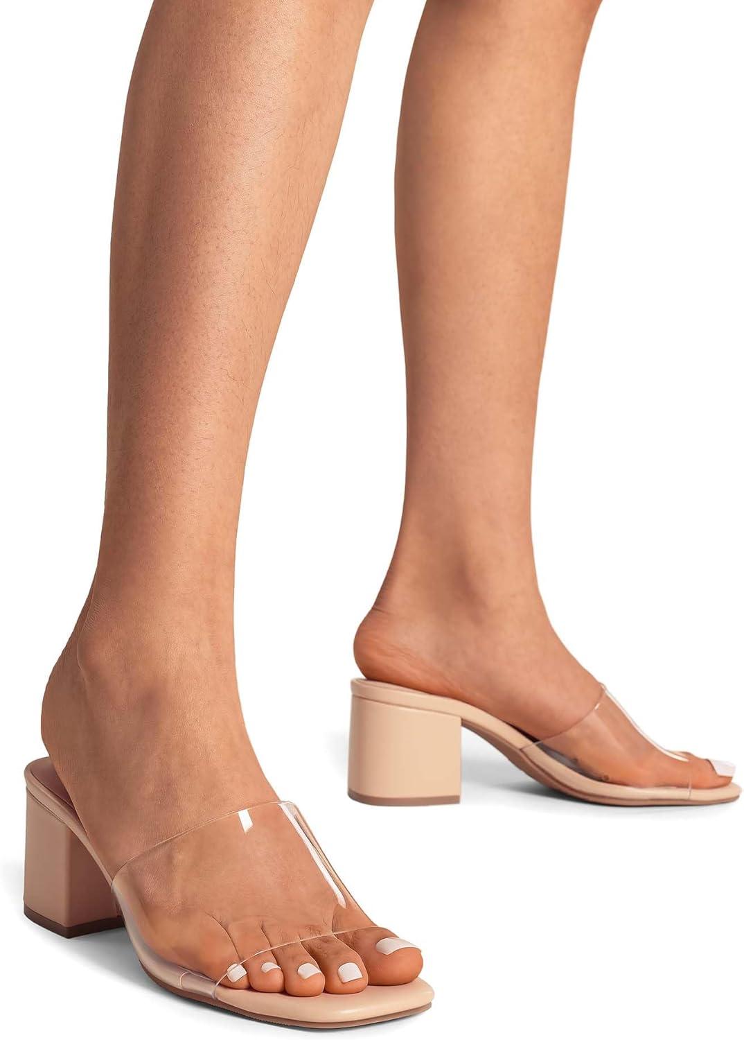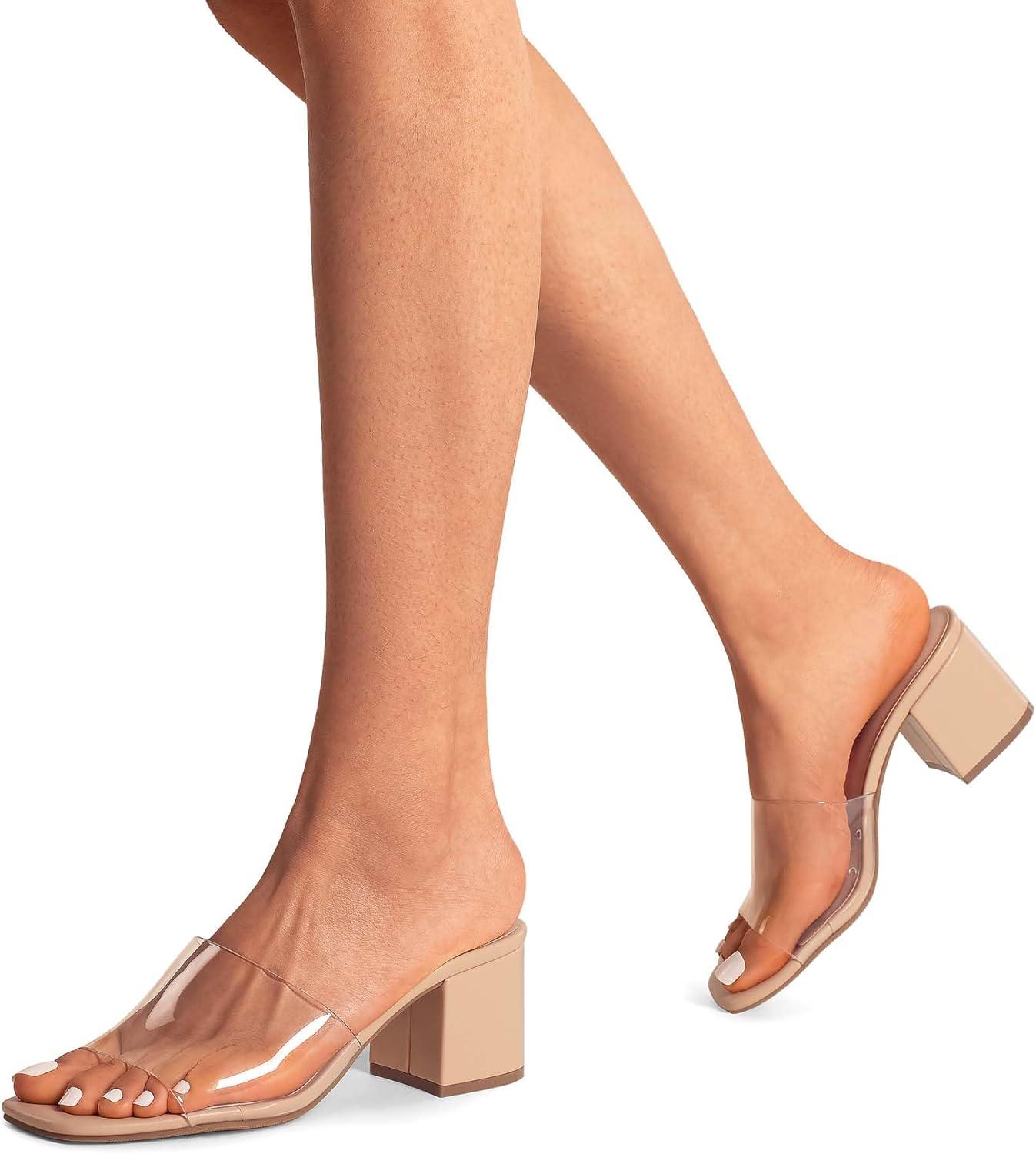 DREAM PAIRS Women’s Square Open Toe Heels Sandals Low Block Chunky Heeled Sandals Slide Sandals Slip on Comfortable Casual Pumps Shoes(Nude-clear)