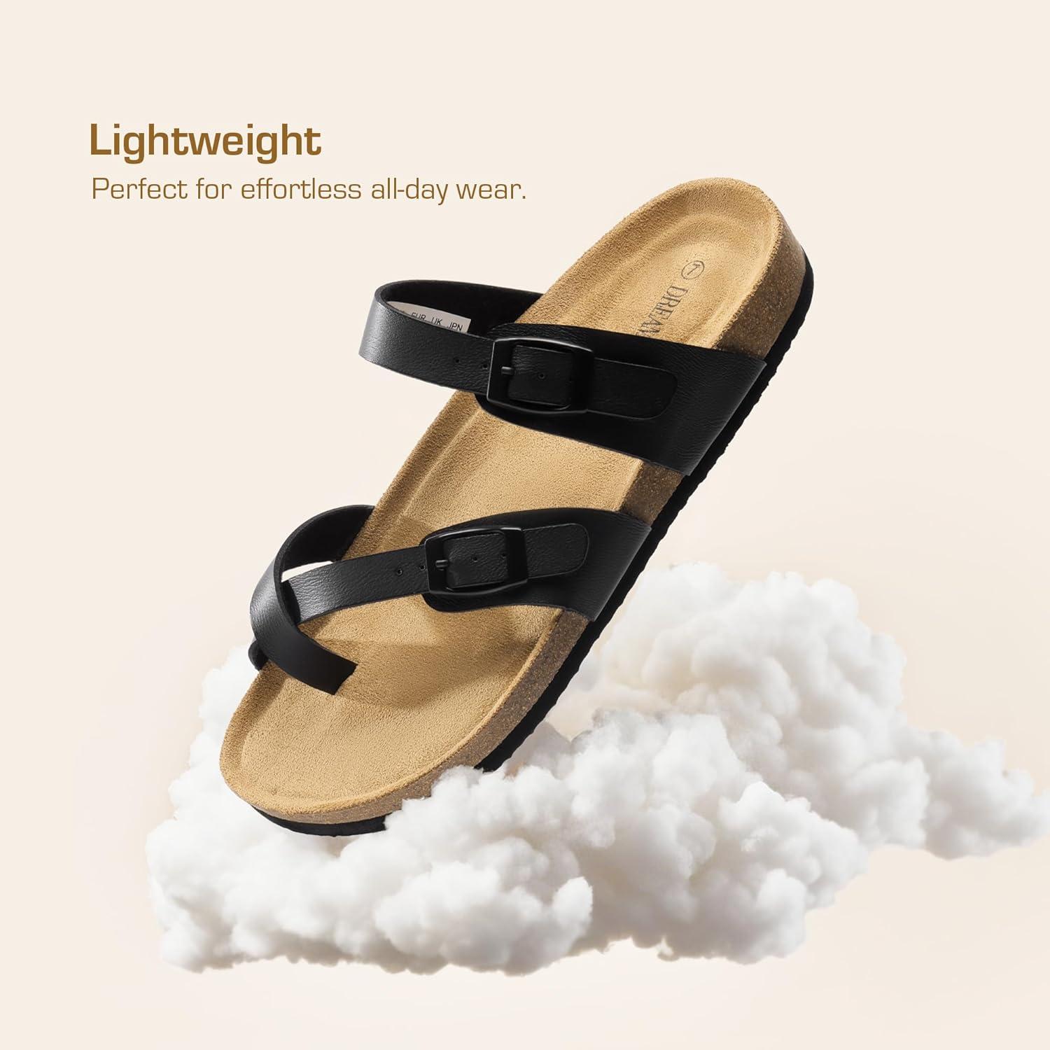 DREAM PAIRS Women’s Thong Slide Sandals with Cork Footbed Open Toe Adjustable Slip On Slippers Comfort Flat Sandals for Summer(Black)