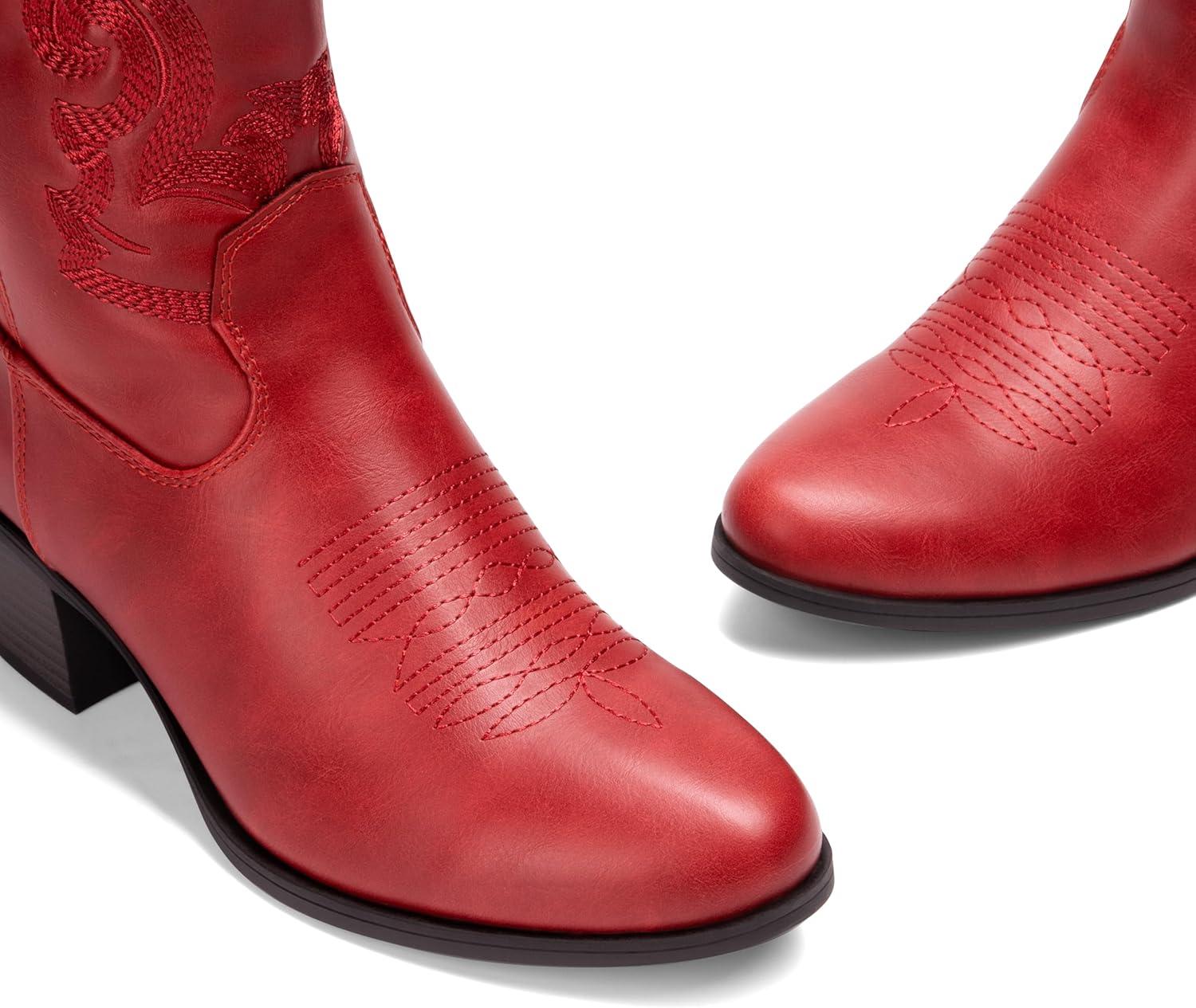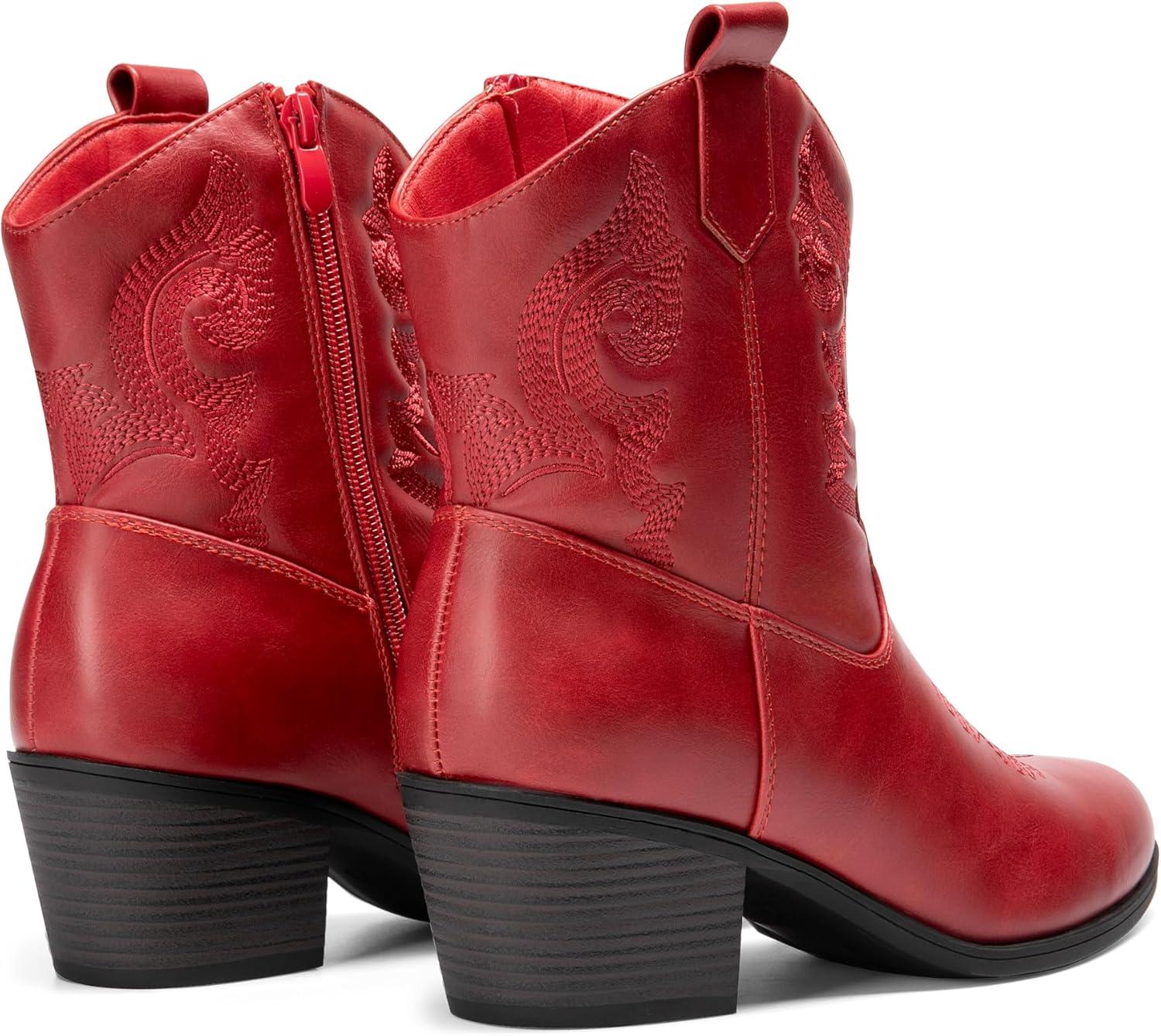 DREAM PAIRS Women’s Western Cowboy Cowgirl Embroidered Ankle Boots Fashion Low chunky Heel Round Toe Fall Short Booties Shoes(Red)