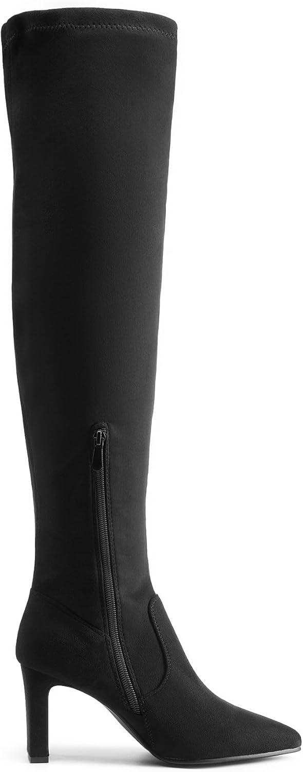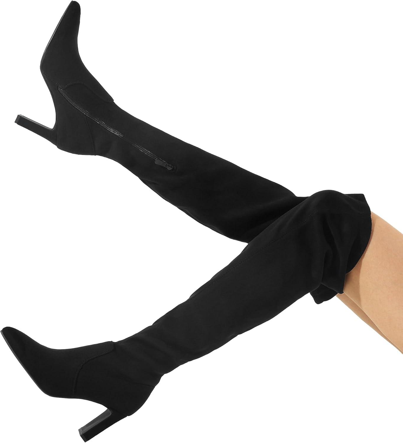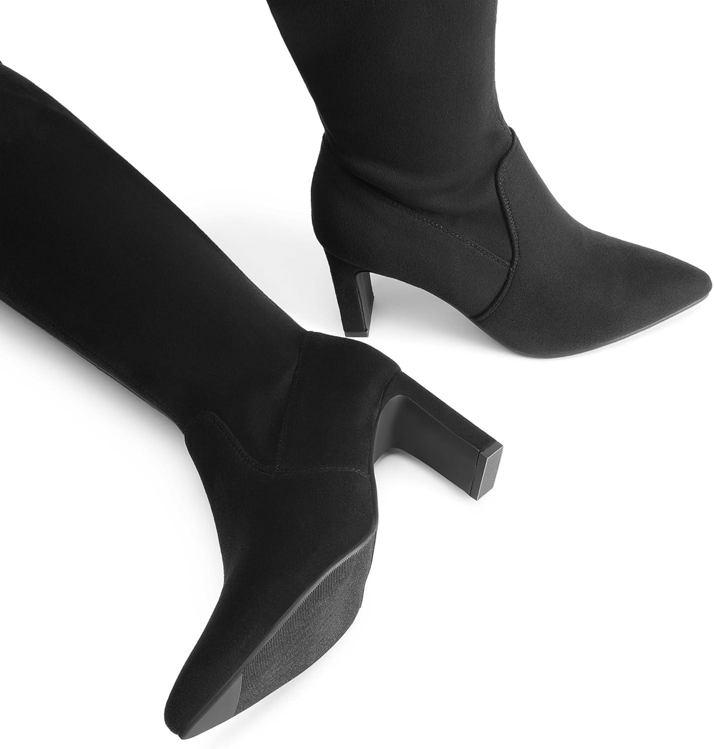 DREAM PAIRS Women’s Over The Knee Stretch Thigh High Boots Chunky High Heels Pointed Toe Long Fall Boots(Black-suede)