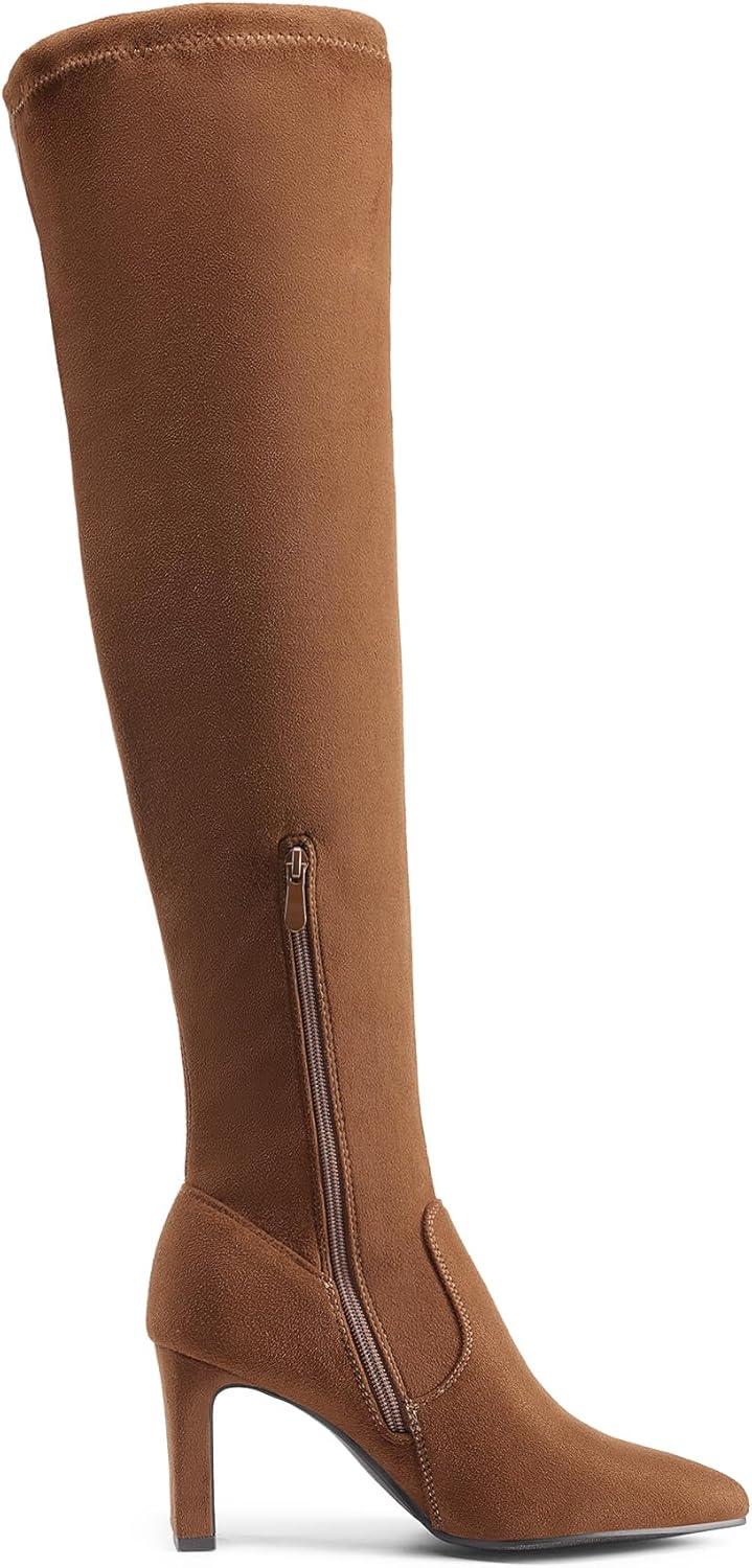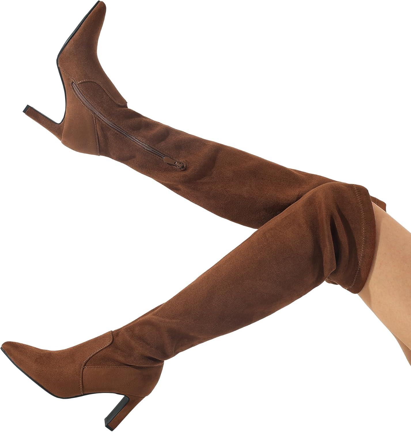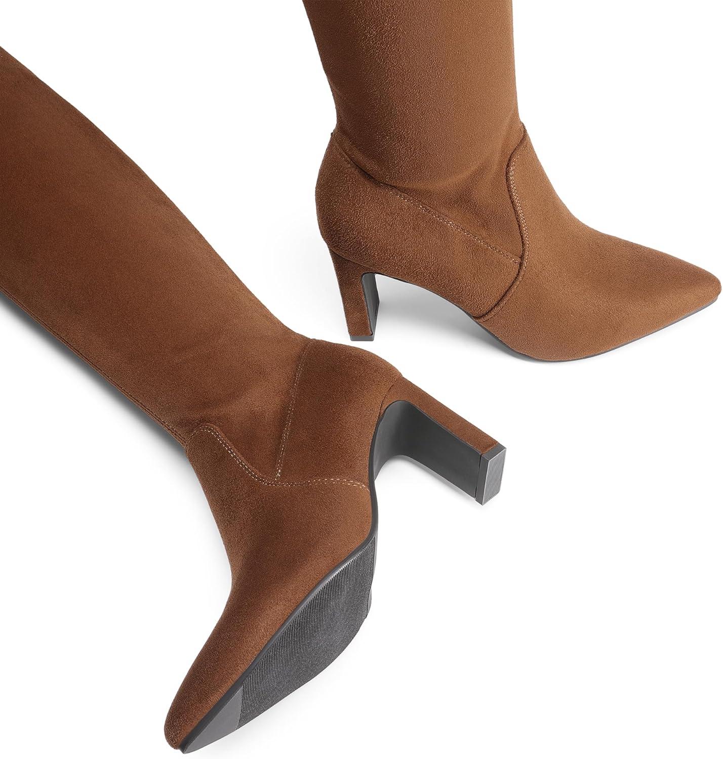 DREAM PAIRS Women’s Over The Knee Stretch Thigh High Boots Chunky High Heels Pointed Toe Long Fall Boots(Brown-suede)