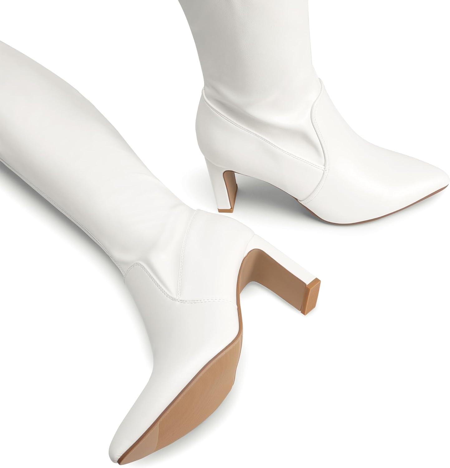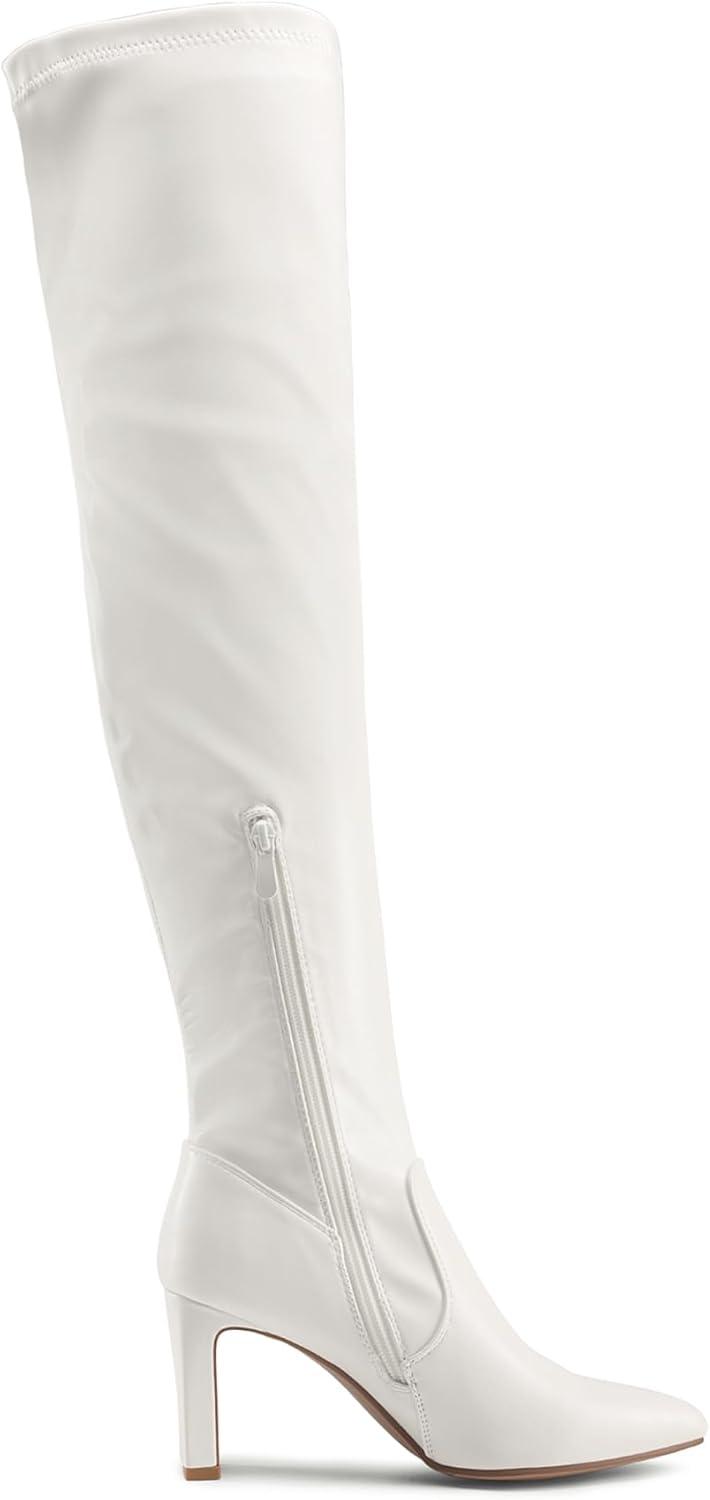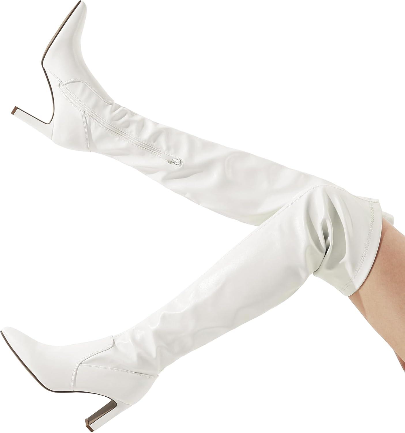 DREAM PAIRS Women’s Over The Knee Stretch Thigh High Boots Chunky High Heels Pointed Toe Long Fall Boots(White-pu)