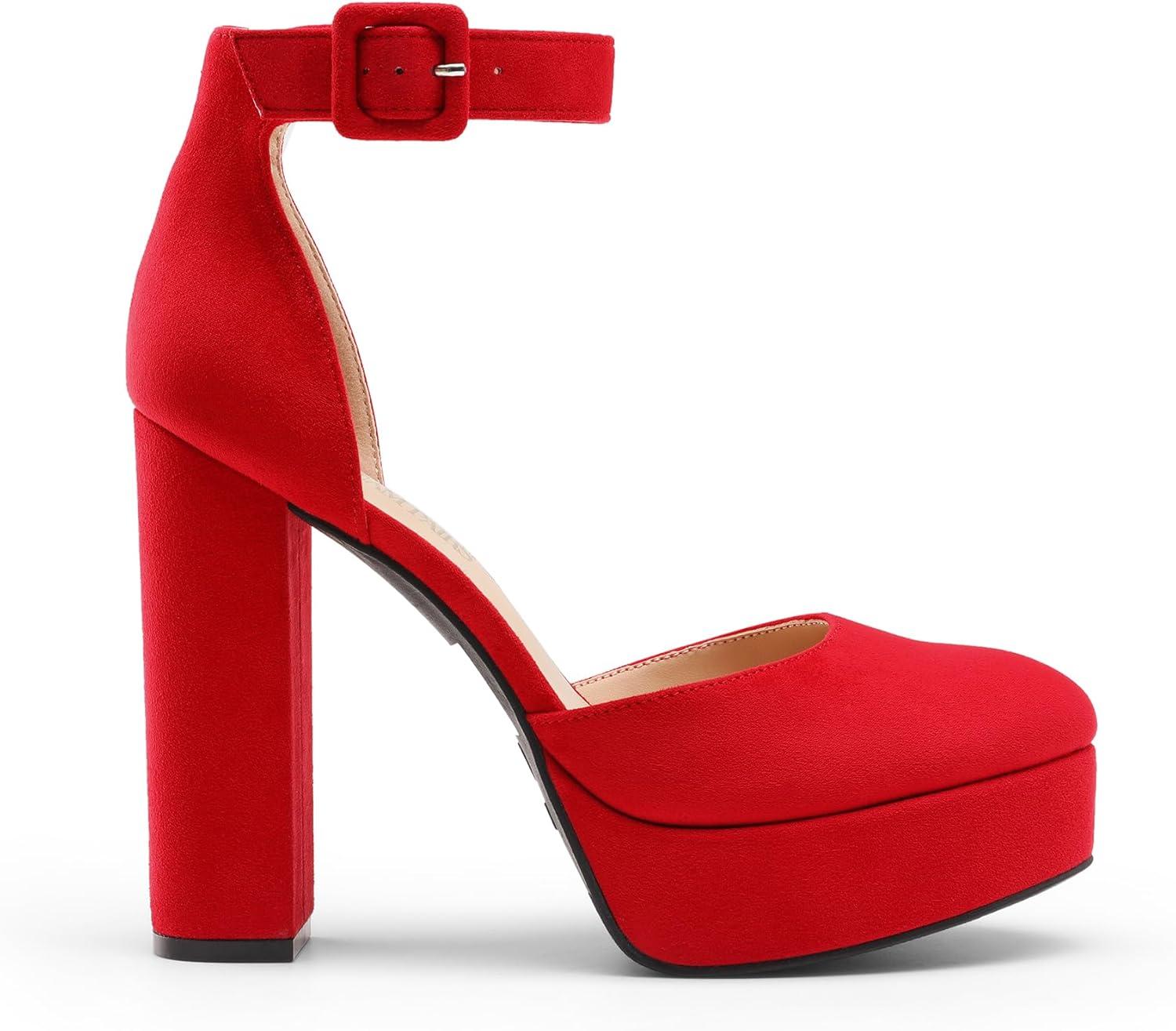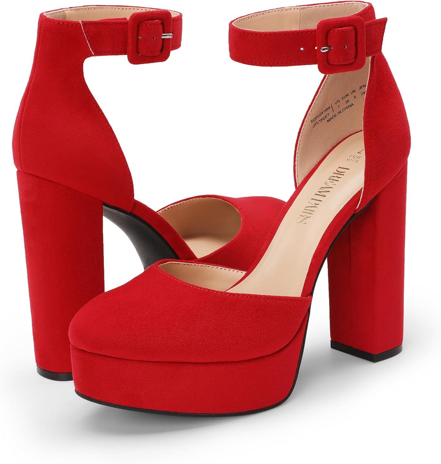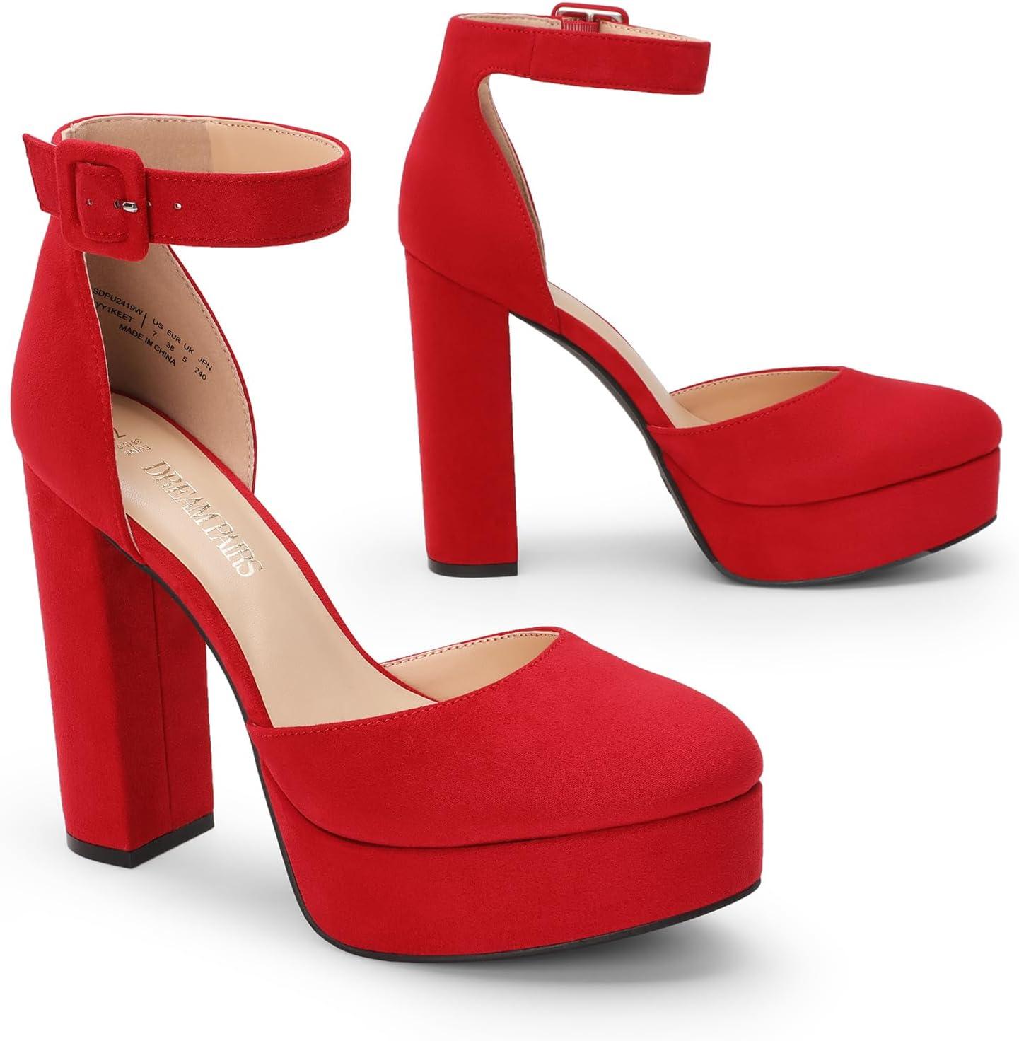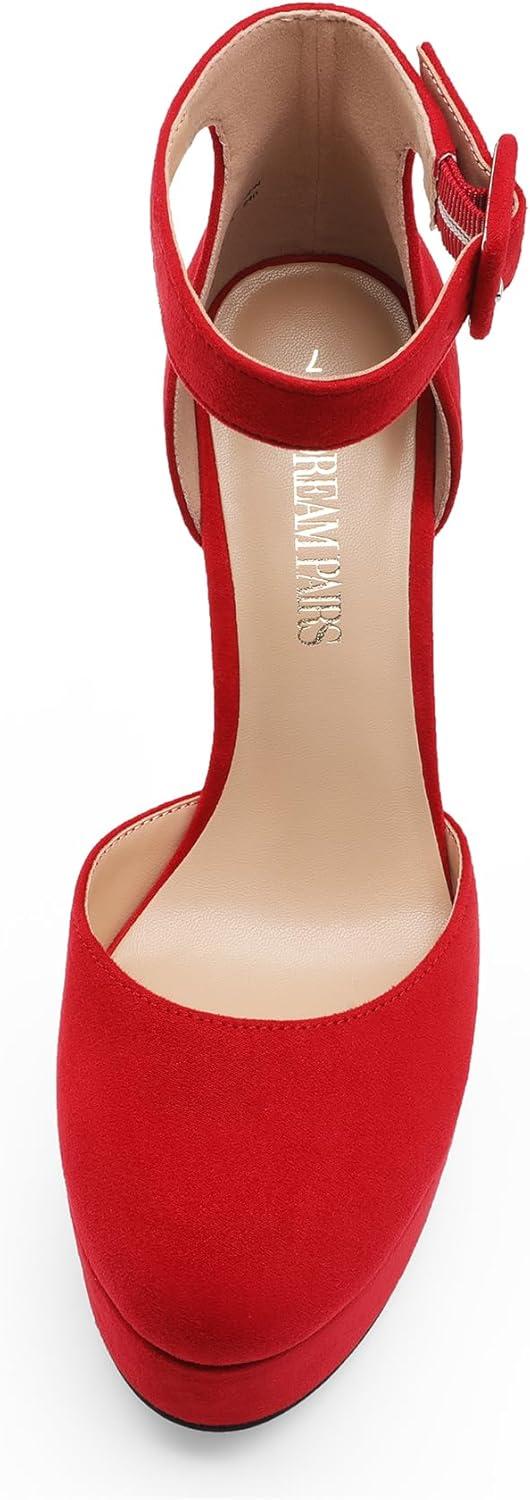 DREAM PAIRS Women’s Platform High Chunky Heels Closed Toe Block Ankle Strap Dress Buckle Round Toe Wedding Party Comfortable Pumps Shoes(Red-suede)