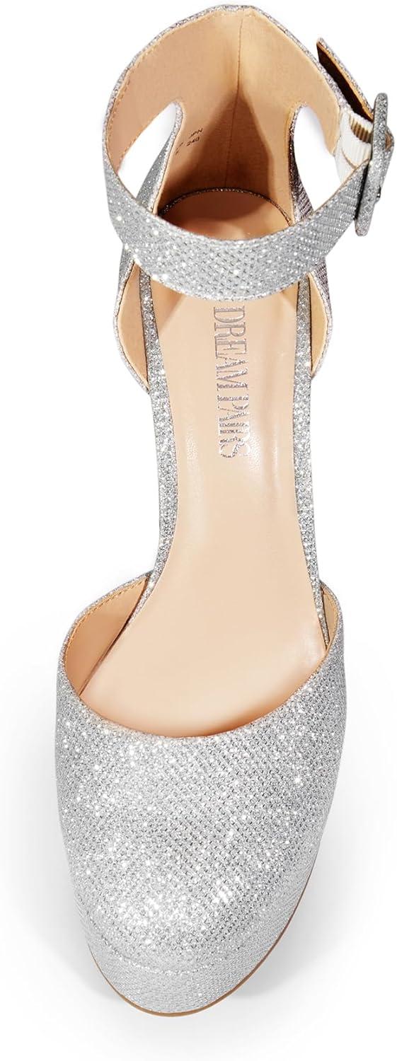 DREAM PAIRS Women’s Platform High Chunky Heels Closed Toe Block Ankle Strap Dress Buckle Round Toe Wedding Party Comfortable Pumps Shoes(Silver-glitter)
