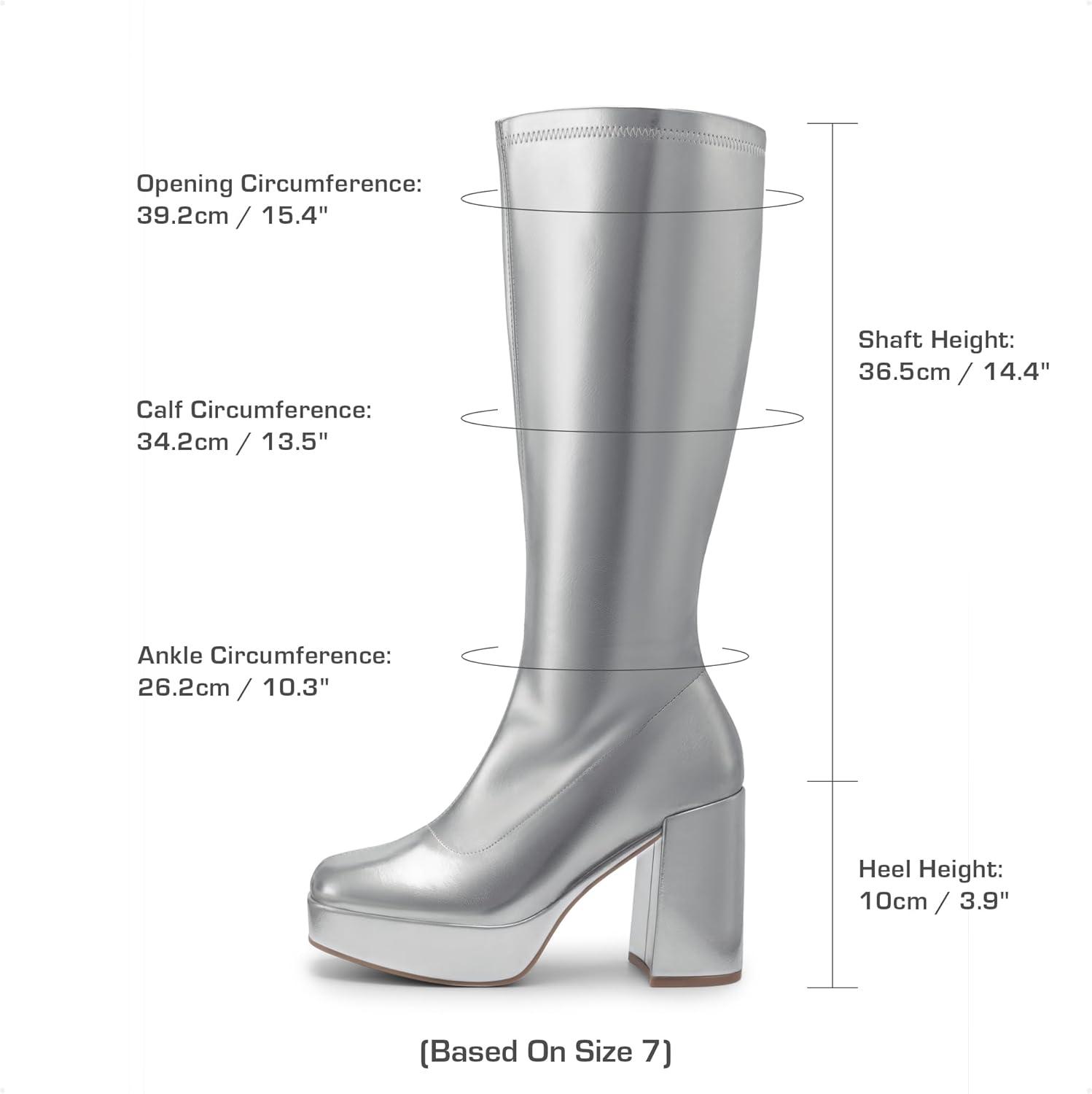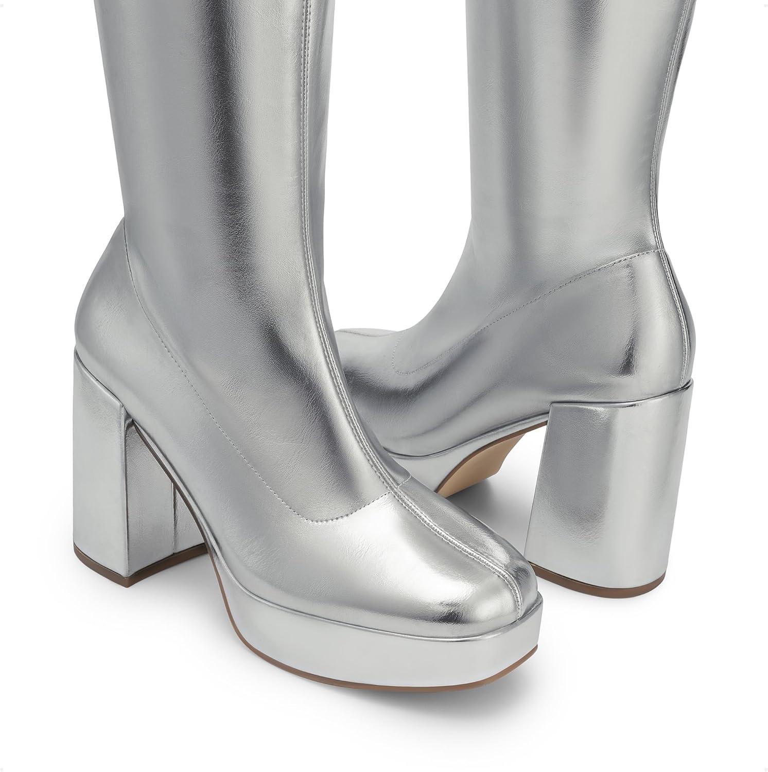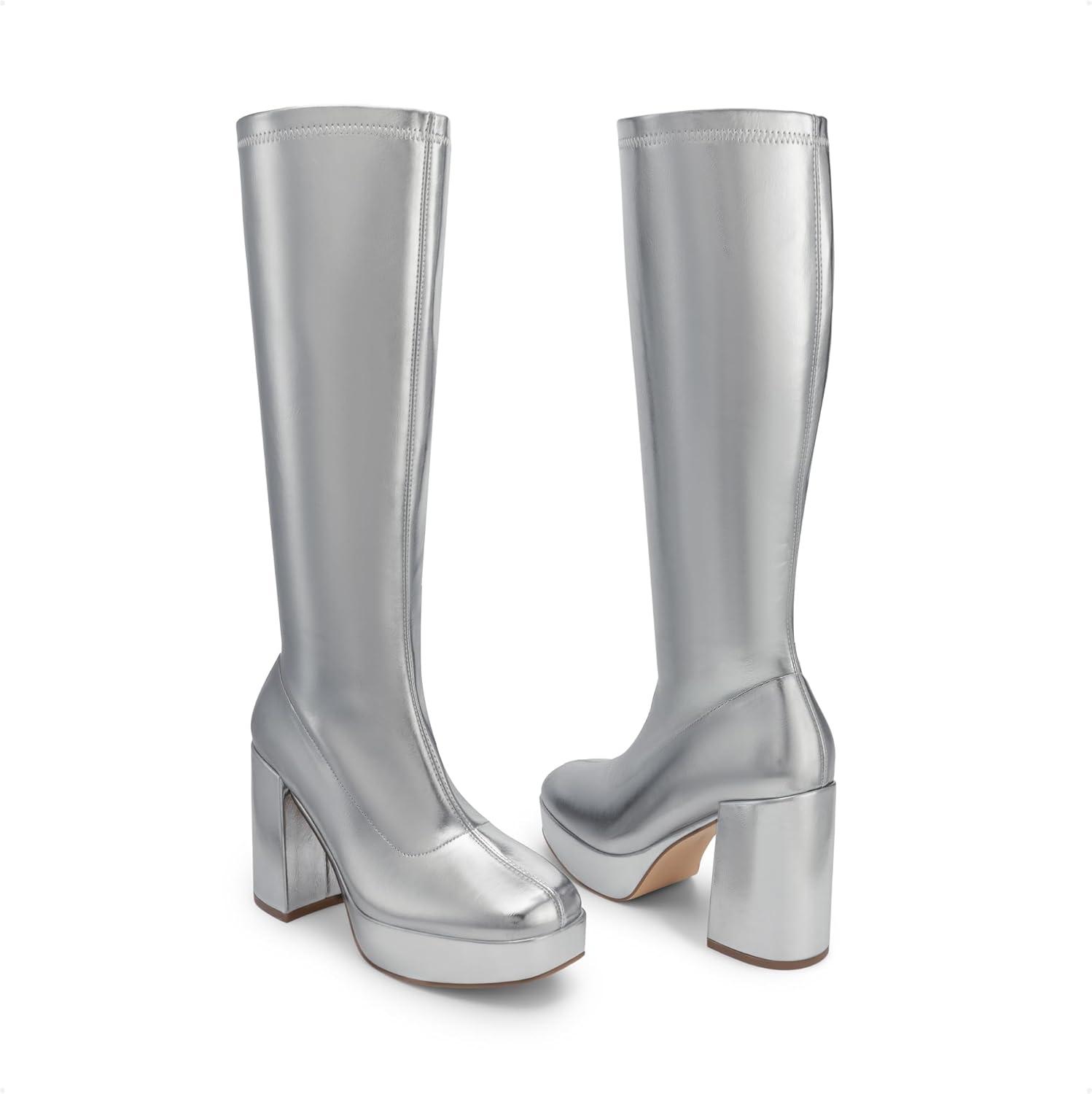 DREAM PAIRS Women’s Platform Knee High Boots Chunky Block Heel Side Zipper Cute Gogo Boots(Silver-pu)