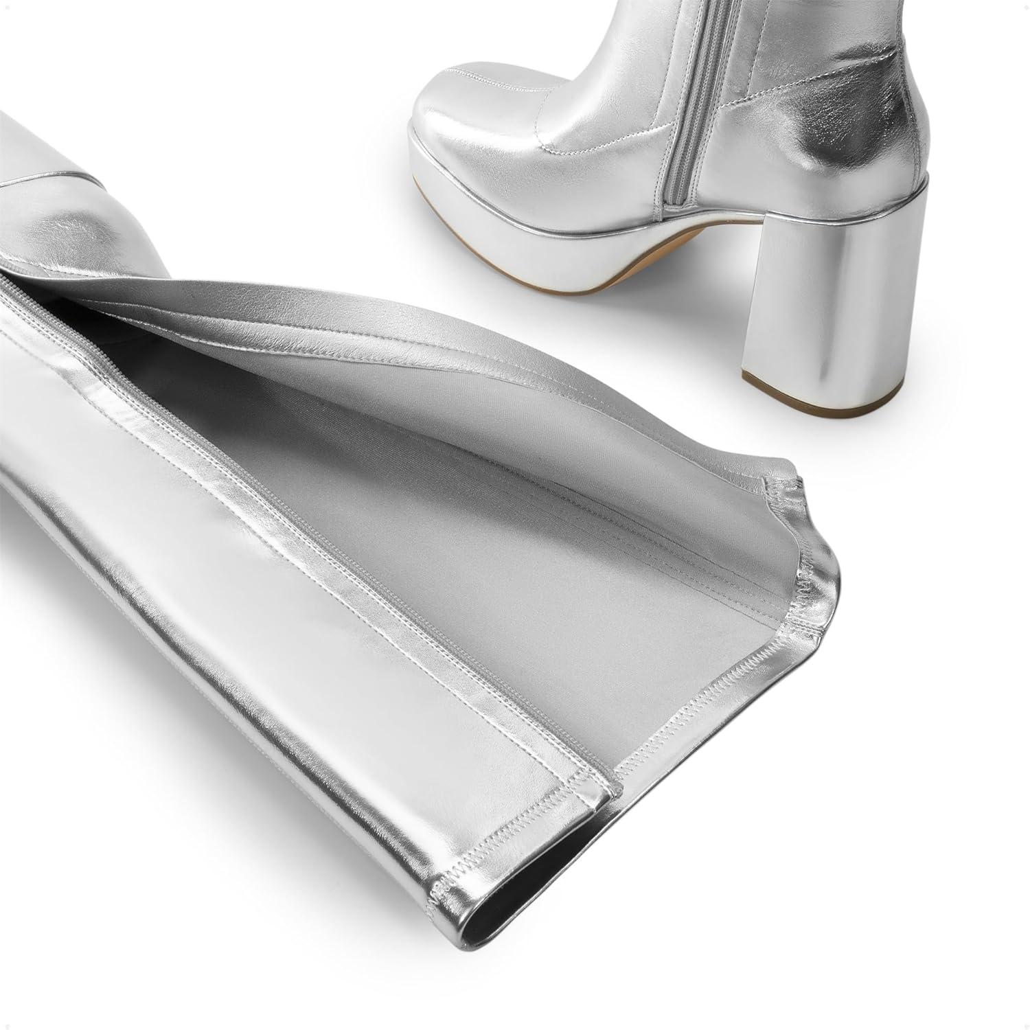 DREAM PAIRS Women’s Platform Gogo Ankle Boots High Chunky Block Heel Square Toe Booties Shoes(Silver)